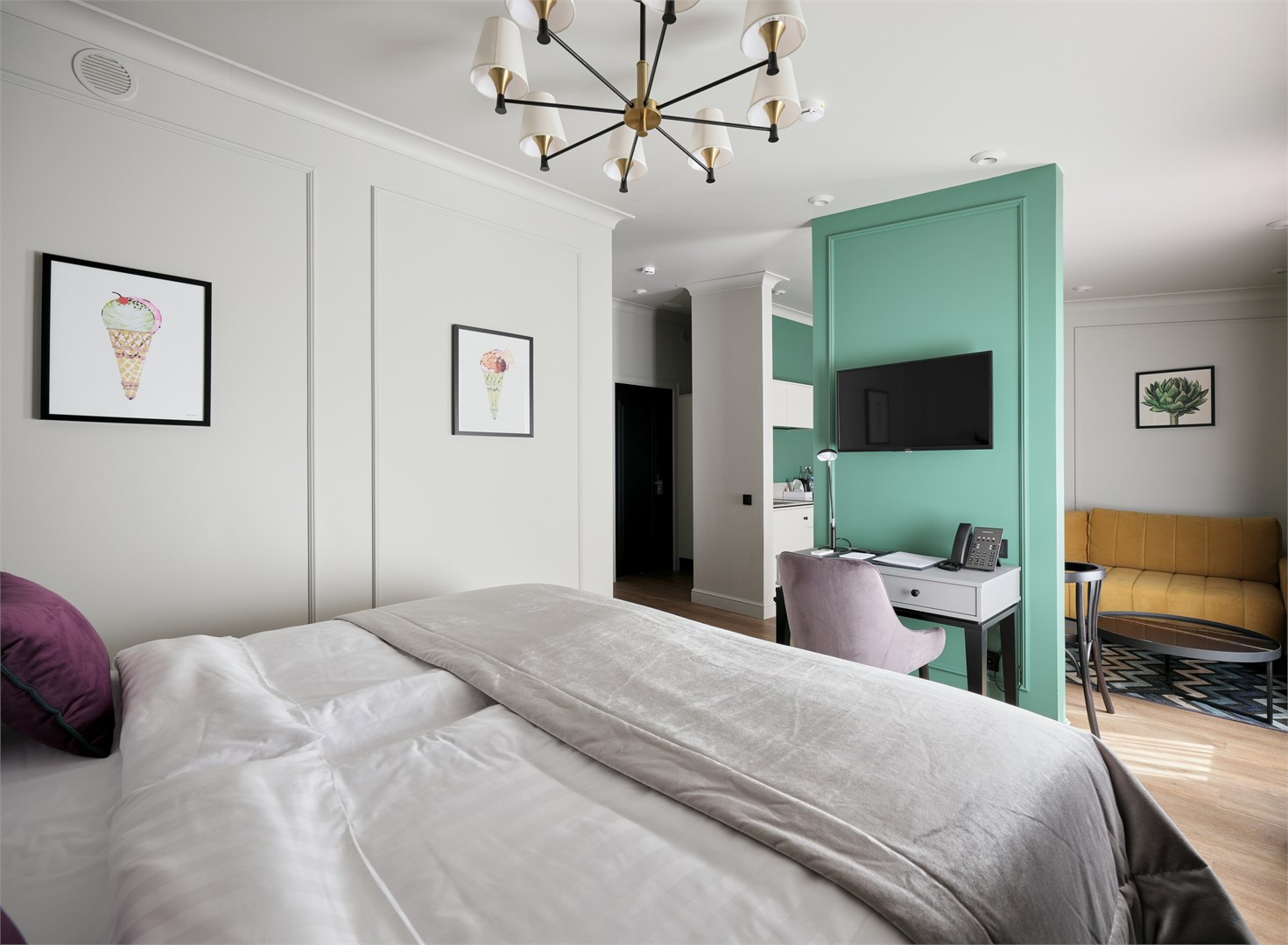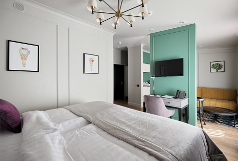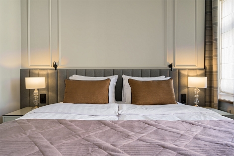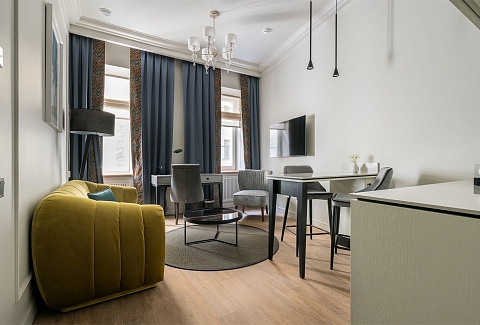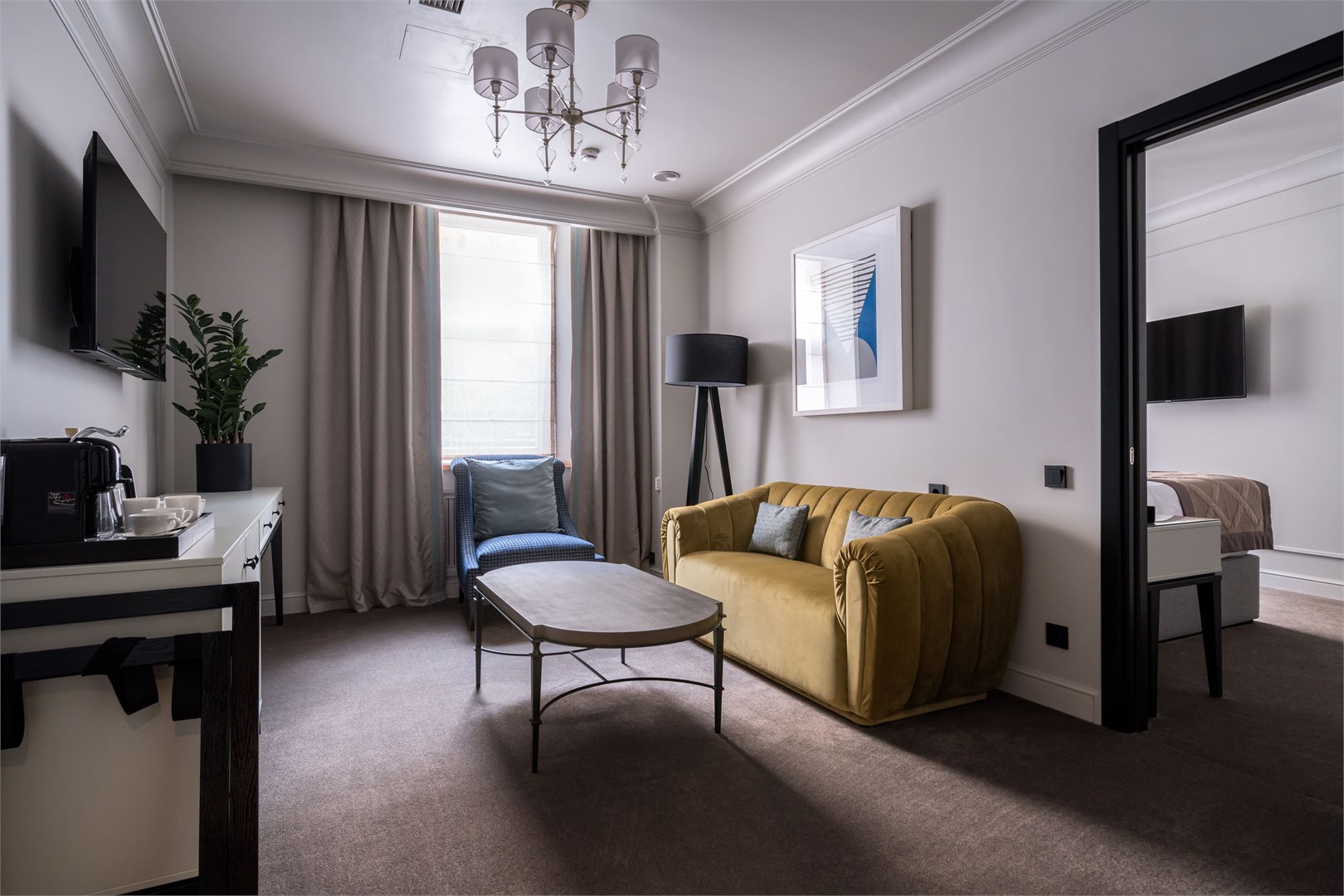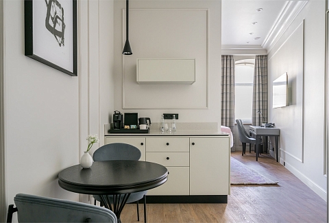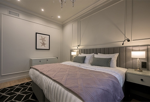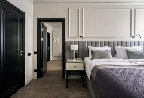 В номере: вешалка, диван, зеркало, кресло, кровать двуспальная, прикроватные тумбочки, стол, столик журнальный, стулья, шкаф, гладильная доска, кондиционер, кофемашина, мини-холодильник, сушилка для белья, телевизор, телефон, утюг, чайный набор посуды, электрочайник