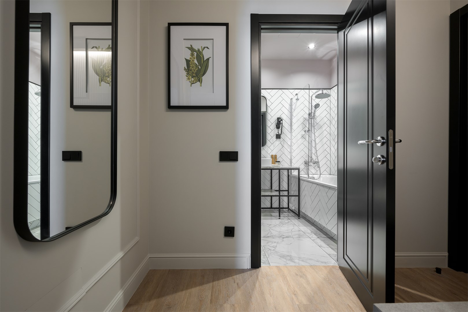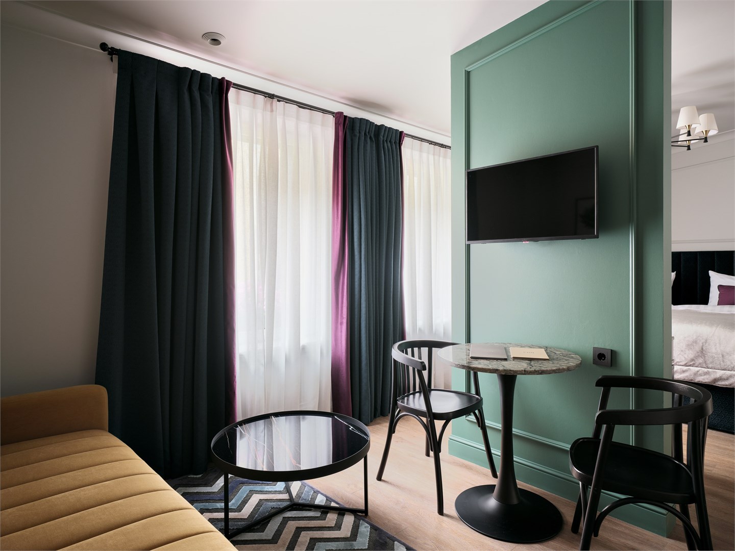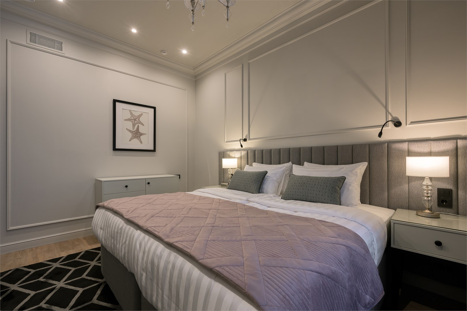В номере: вешалка, диван, зеркало, кресло, кровать двуспальная, прикроватные тумбочки, стол, столик журнальный, стулья, шкаф, гладильная доска, кондиционер, кофемашина, мини-холодильник, сушилка для белья, телевизор, телефон, утюг, чайный набор посуды, электрочайник
