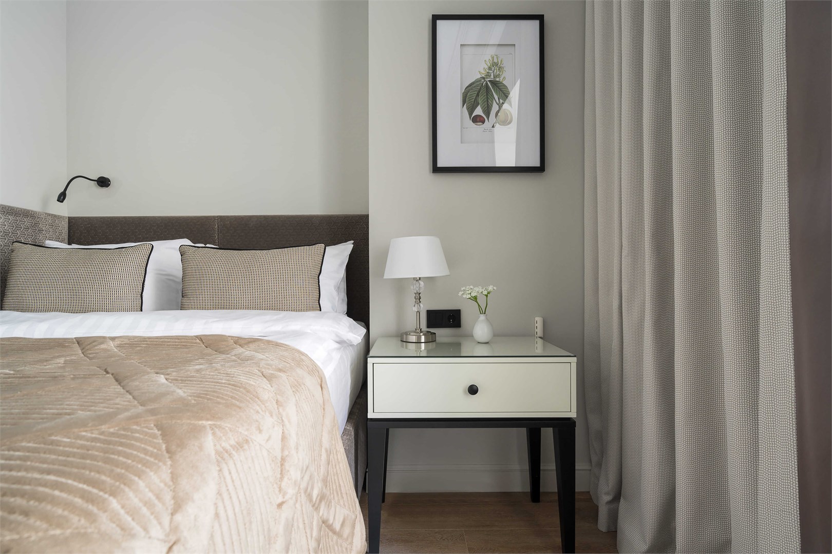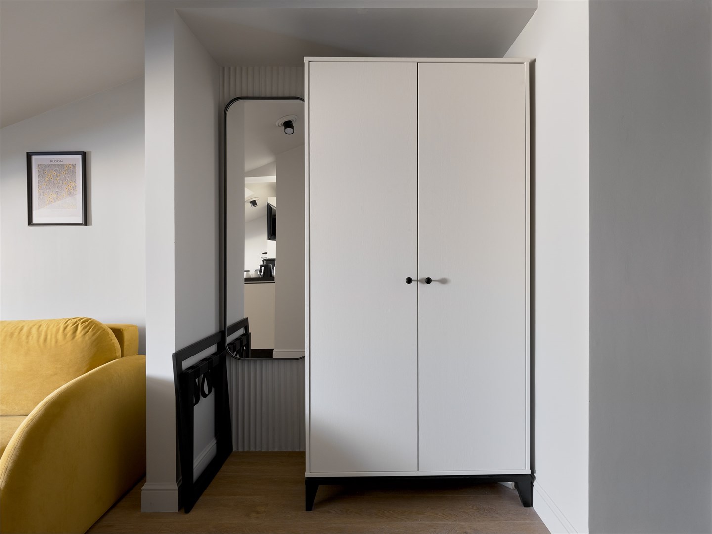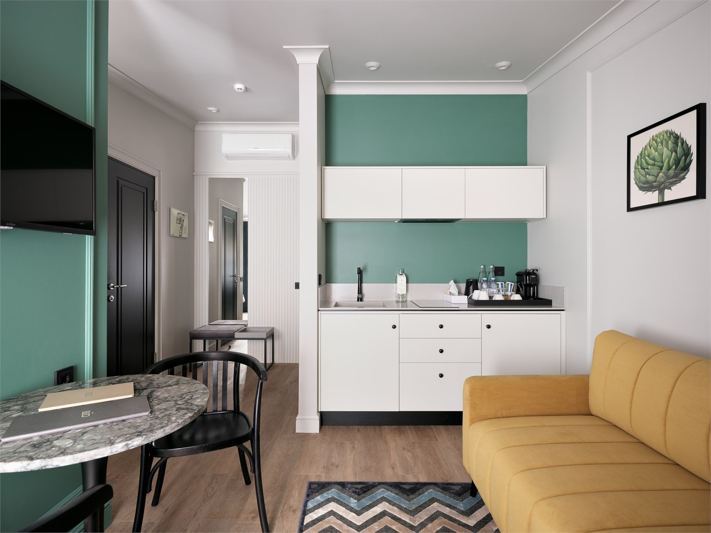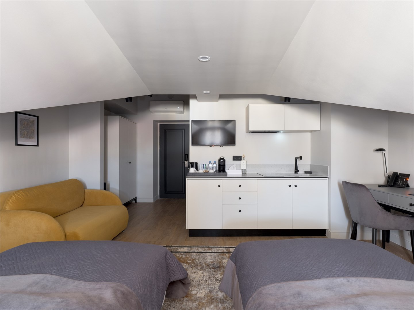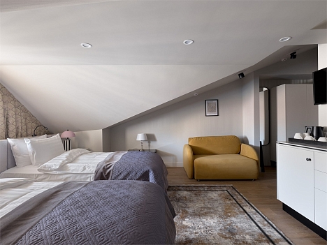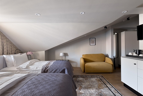 В номере: вешалка, диван, зеркало, кровати односпальные, прикроватные тумбочки, стол, стул, шкаф, гладильная доска, кондиционер, кофемашина, мини-холодильник, набор посуды, плита электрическая, сушилка для белья, телевизор, телефон, утюг, чайный набор посуды, электрочайник