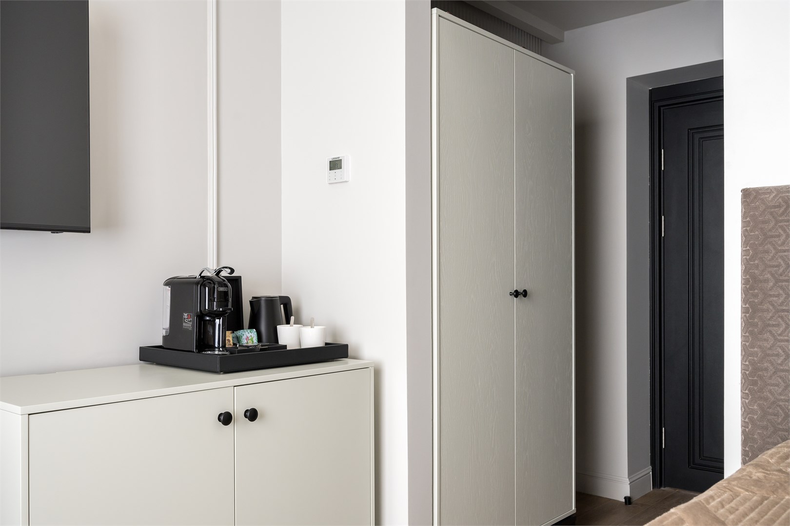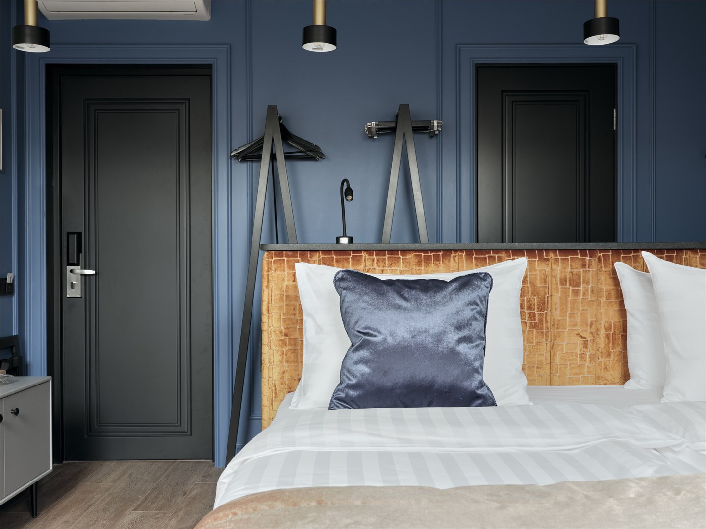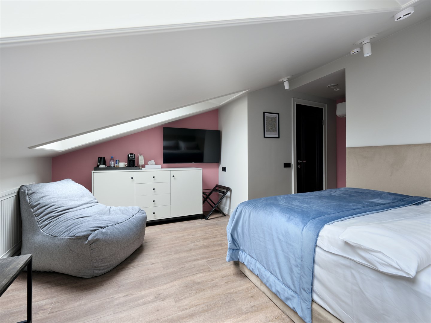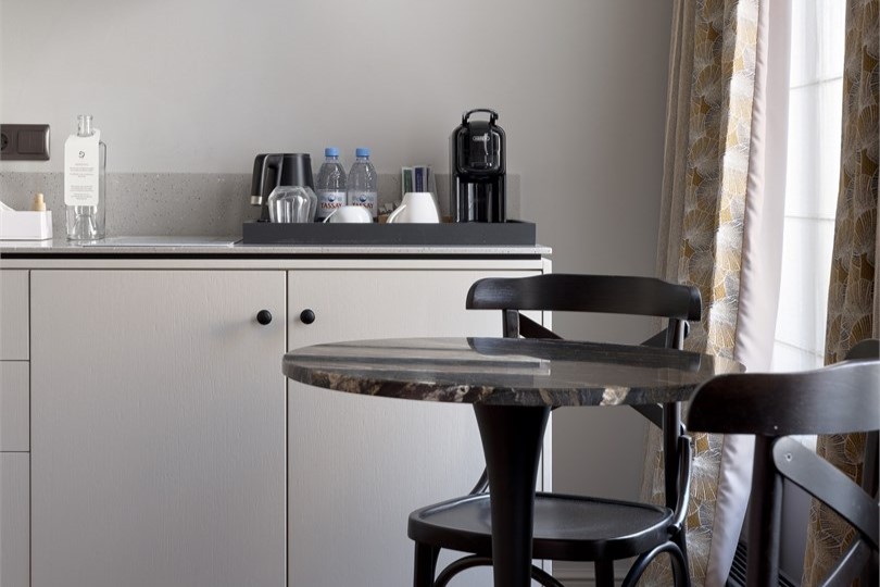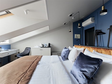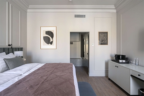 В номере: вешалка, зеркало, кровать двуспальная, прикроватные тумбочки, стол, стул, шкаф, гладильная доска, кондиционер, кофемашина, мини-холодильник, сушилка для белья, телевизор, телефон, утюг, чайный набор посуды, электрочайник