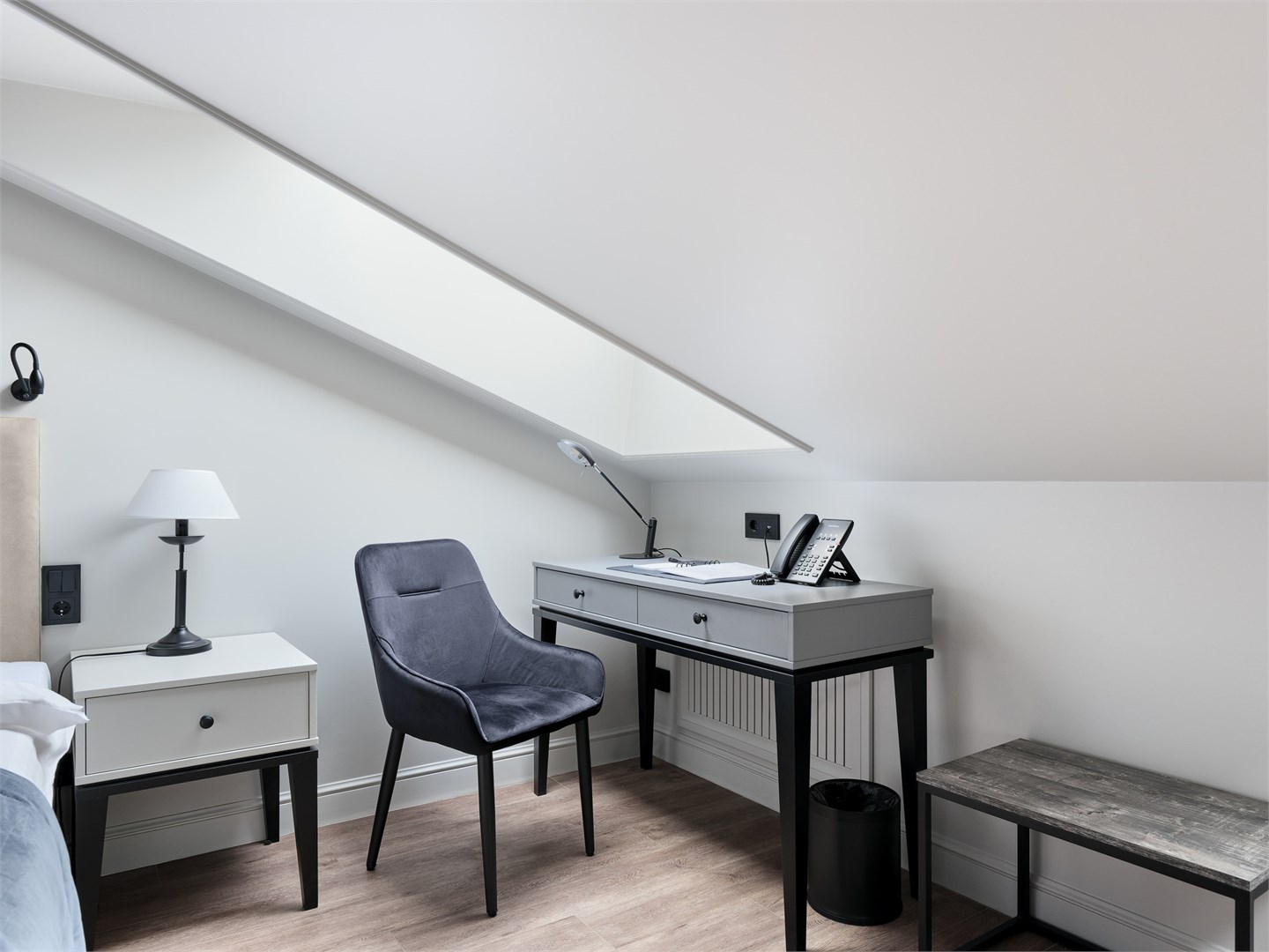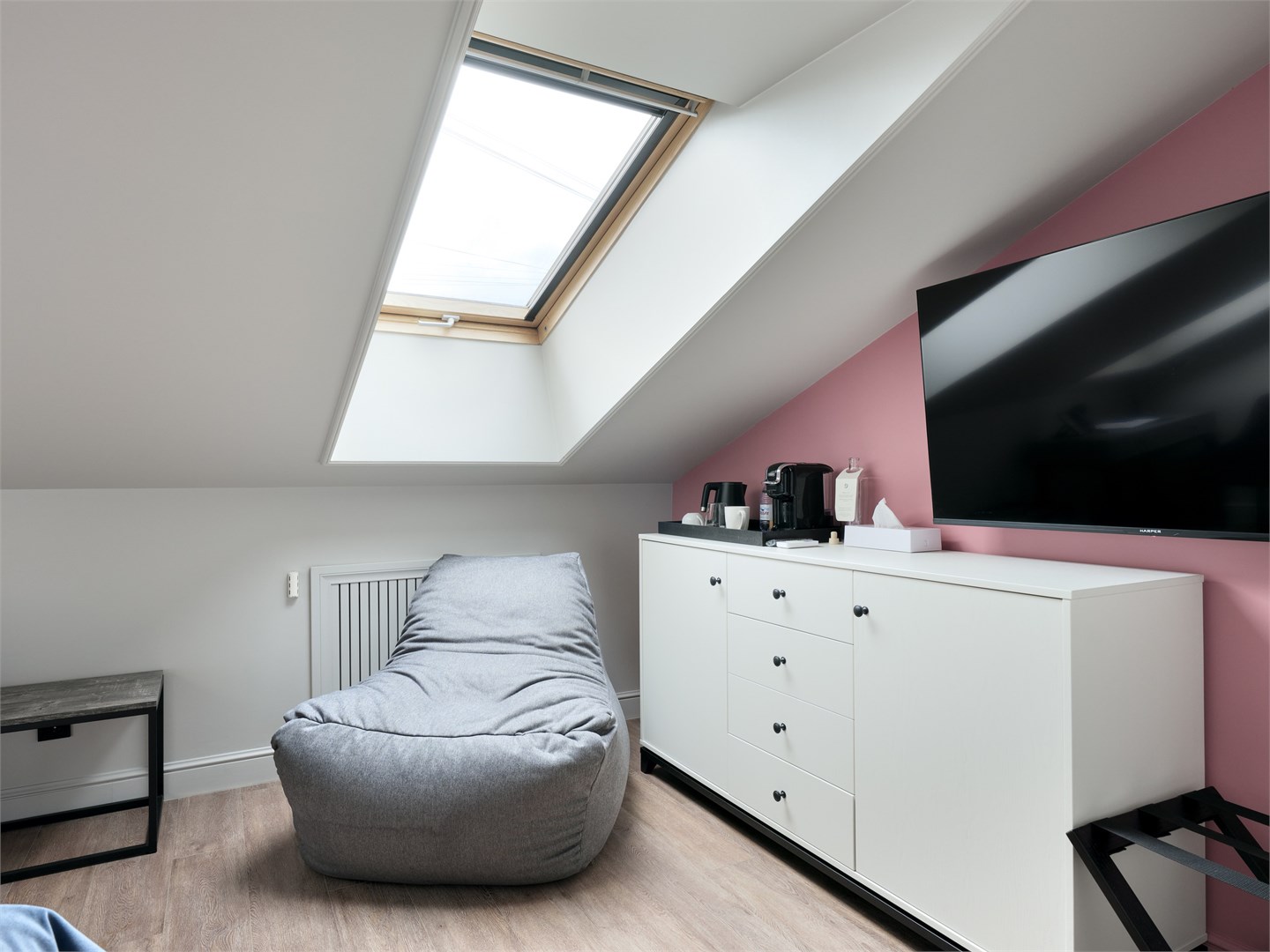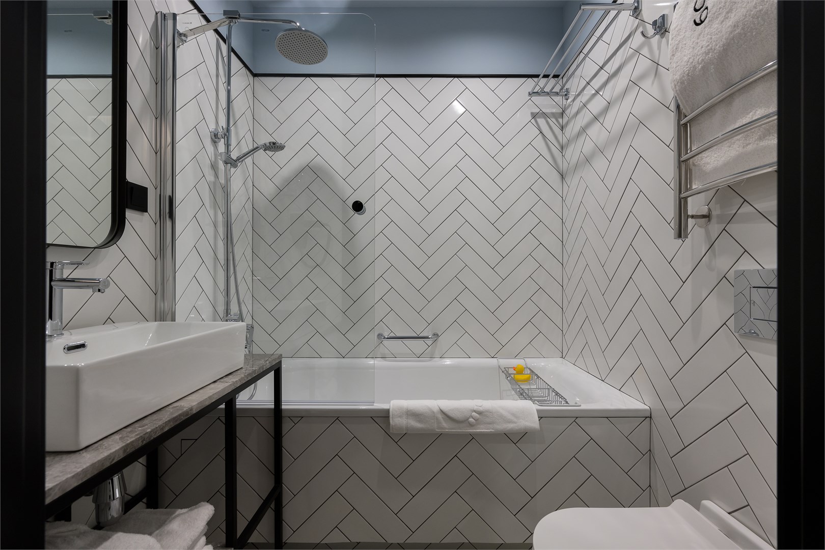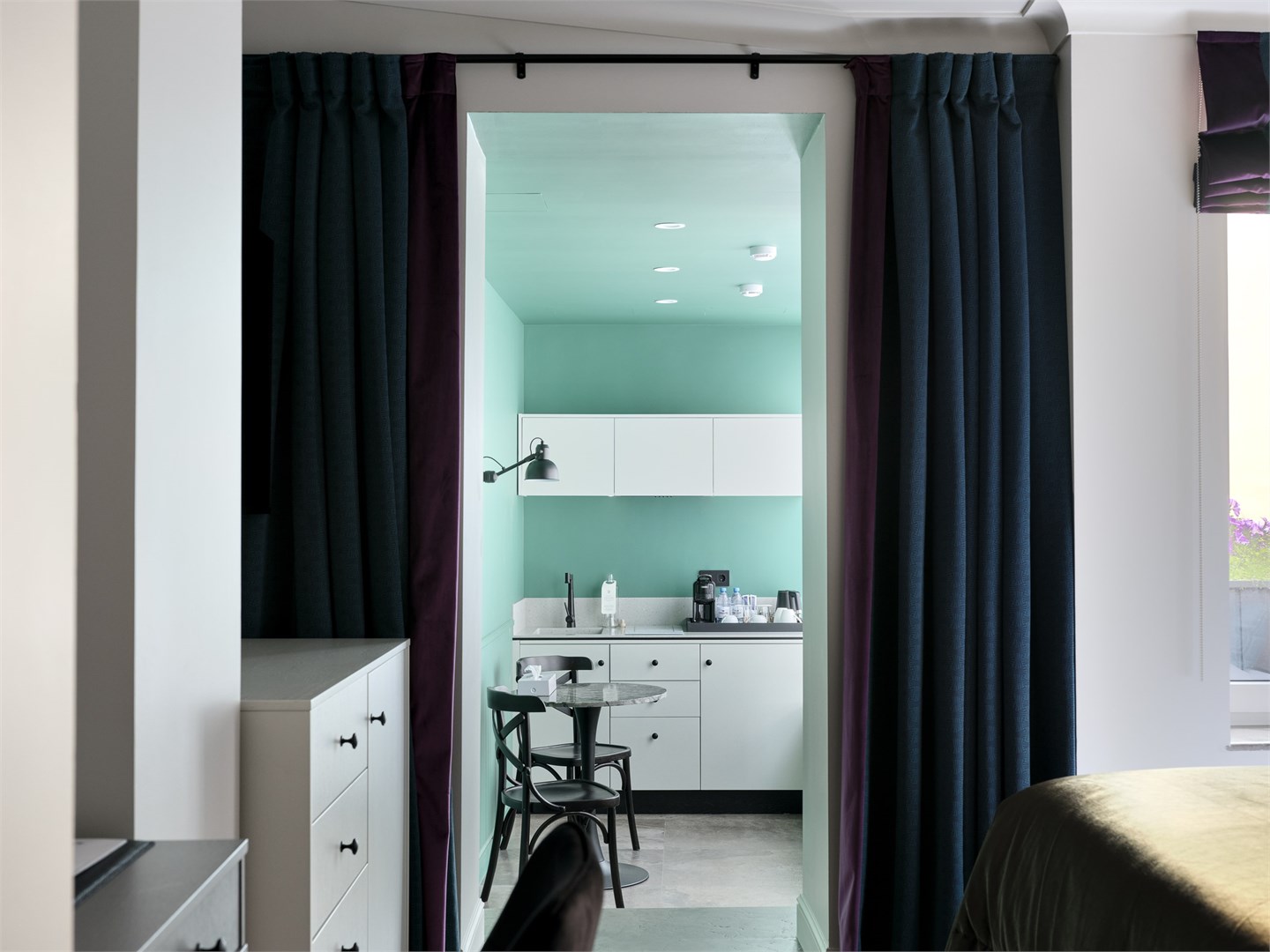 В номере: вешалка, зеркало, кровать двуспальная, прикроватные тумбочки, стол, стул, шкаф, гладильная доска, кондиционер, кофемашина, мини-холодильник, сушилка для белья, телевизор, телефон, утюг, чайный набор посуды, электрочайник