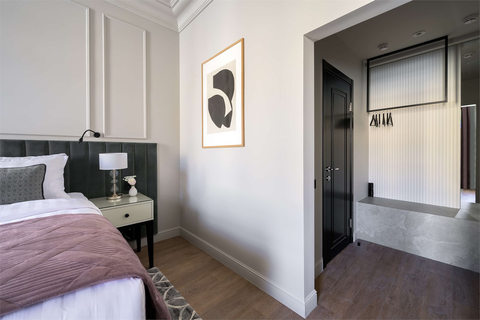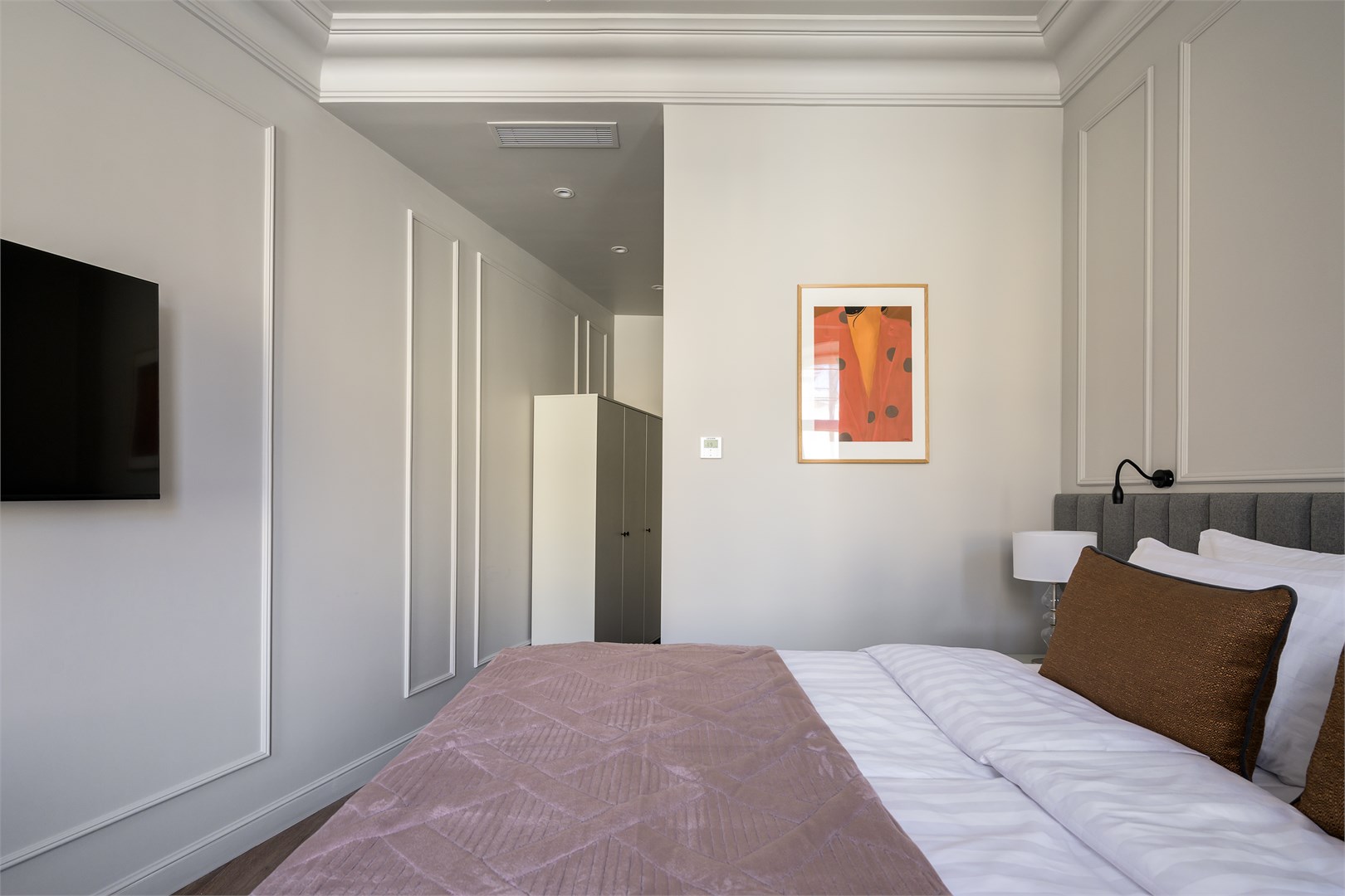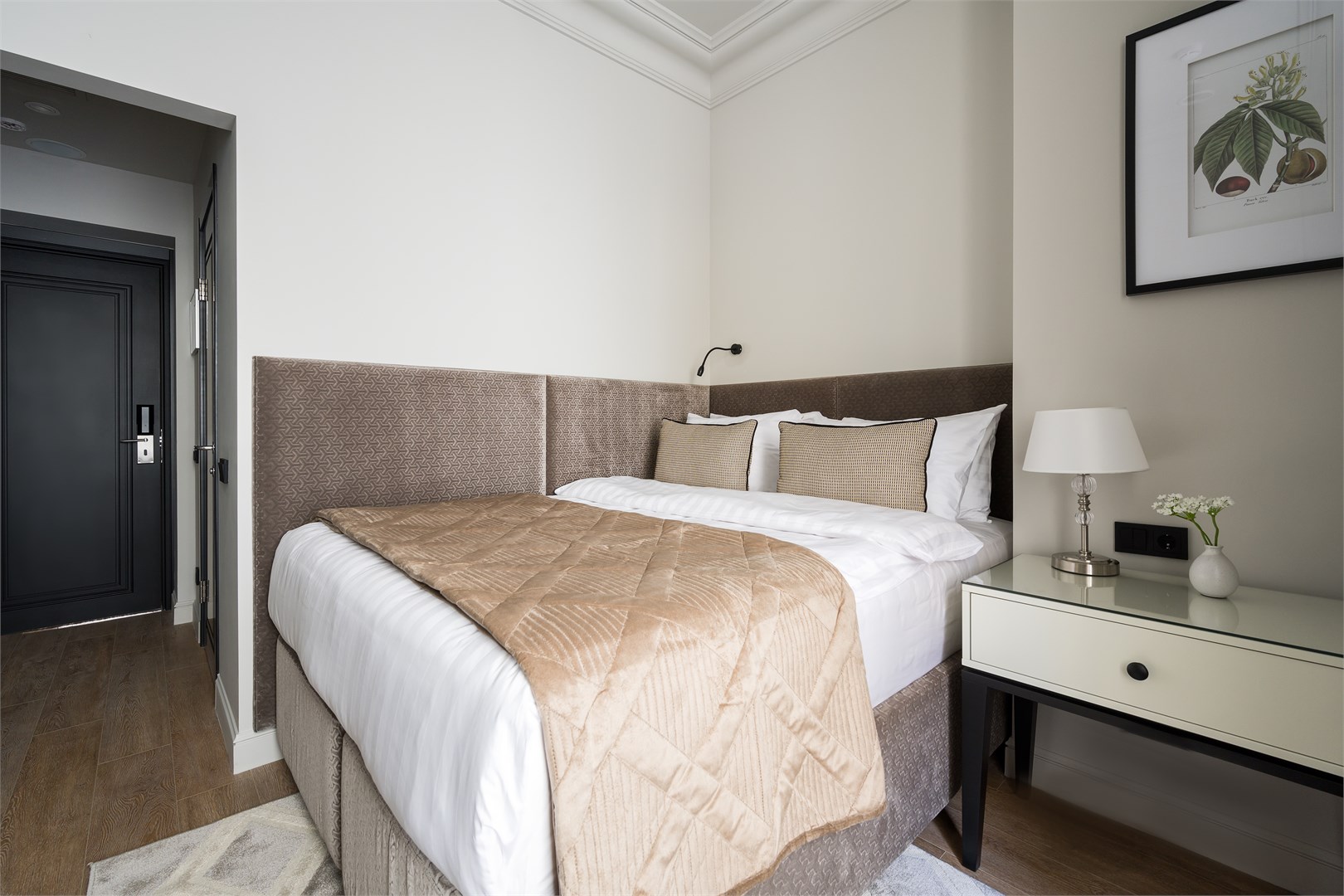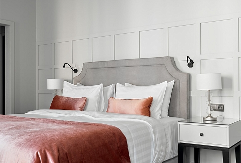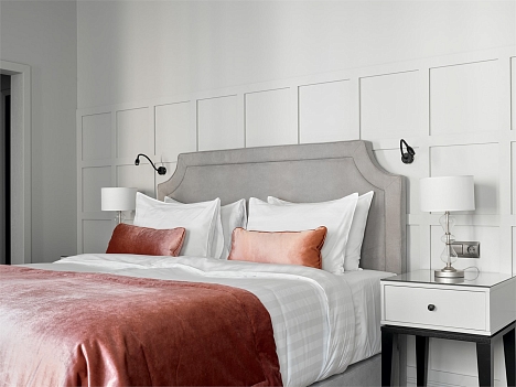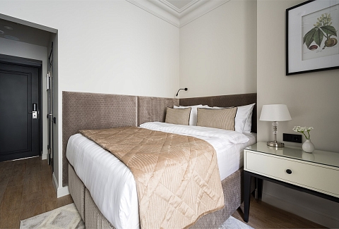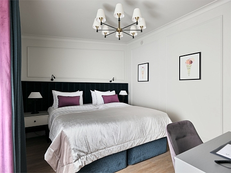 В номере: вешалка, зеркало, кровать двуспальная, прикроватные тумбочки, стол, стулья, шкаф, гладильная доска, кондиционер, кофемашина, мини-холодильник, набор посуды, плита электрическая, сушилка для белья, телевизор, телефон, утюг, чайный набор посуды, электрочайник