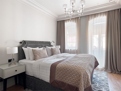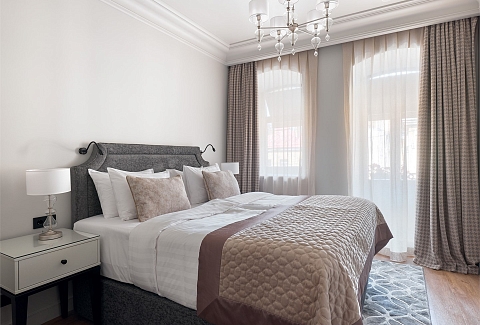 В номере: вешалка, диван, зеркало, кресло, кровать двуспальная, прикроватные тумбочки, стол, столик журнальный, стулья, шкаф, гладильная доска, кондиционер, кофемашина, мини-холодильник, набор посуды, плита электрическая, сушилка для белья, телевизор, телефон, утюг, электрочайник