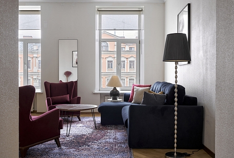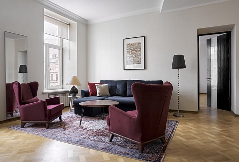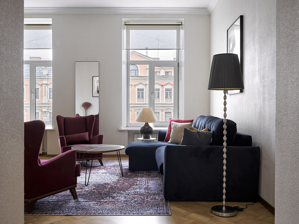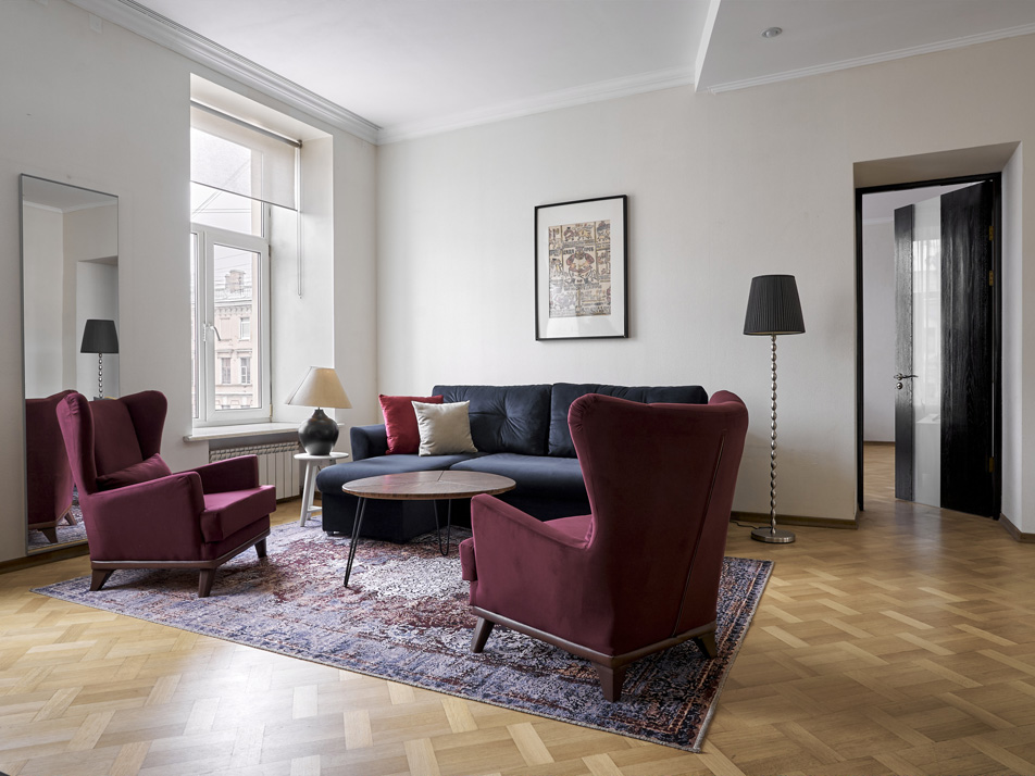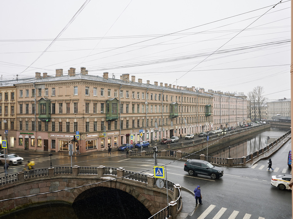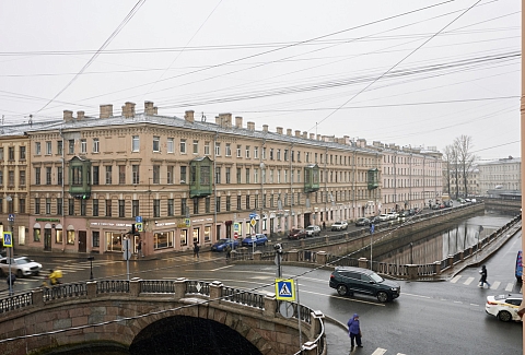 Просторные апартаменты на третьем этаже с четырьмя комнатами, расположенная вблизи Казанского кафедрального собора, занимает 118 квадратных метров. Они излучает ауру спокойствия и безмятежности, обладая великолепной энергетикой. Обилие естественного света.
