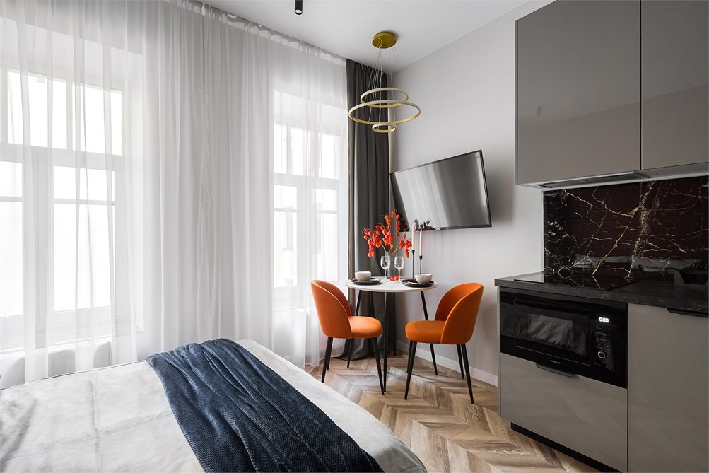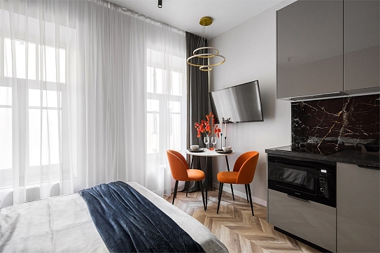 Главные жемчужины города — в шаговой доступности, позволяя возвращаться сюда для отдыха в любое время. Студия, рассчитанная на троих, встречает гостей абсолютно новым дизайнерским ремонтом, где каждая деталь продумана для комфорта. Ортопедический матрас на двуспальной кровати и удобное раскладное кресло обещают глубокий сон. Полноценная кухня, оснащенная духовой печью и всей необходимой утварью, приглашает к приготовлению ужина, а высокоскоростной Wi-Fi — к работе или общению. В собственной ванной комнате под ногами согревают теплые полы, а на кухне можно заварить чай, наблюдая из окна за неторопливой жизнью питерского двора.
