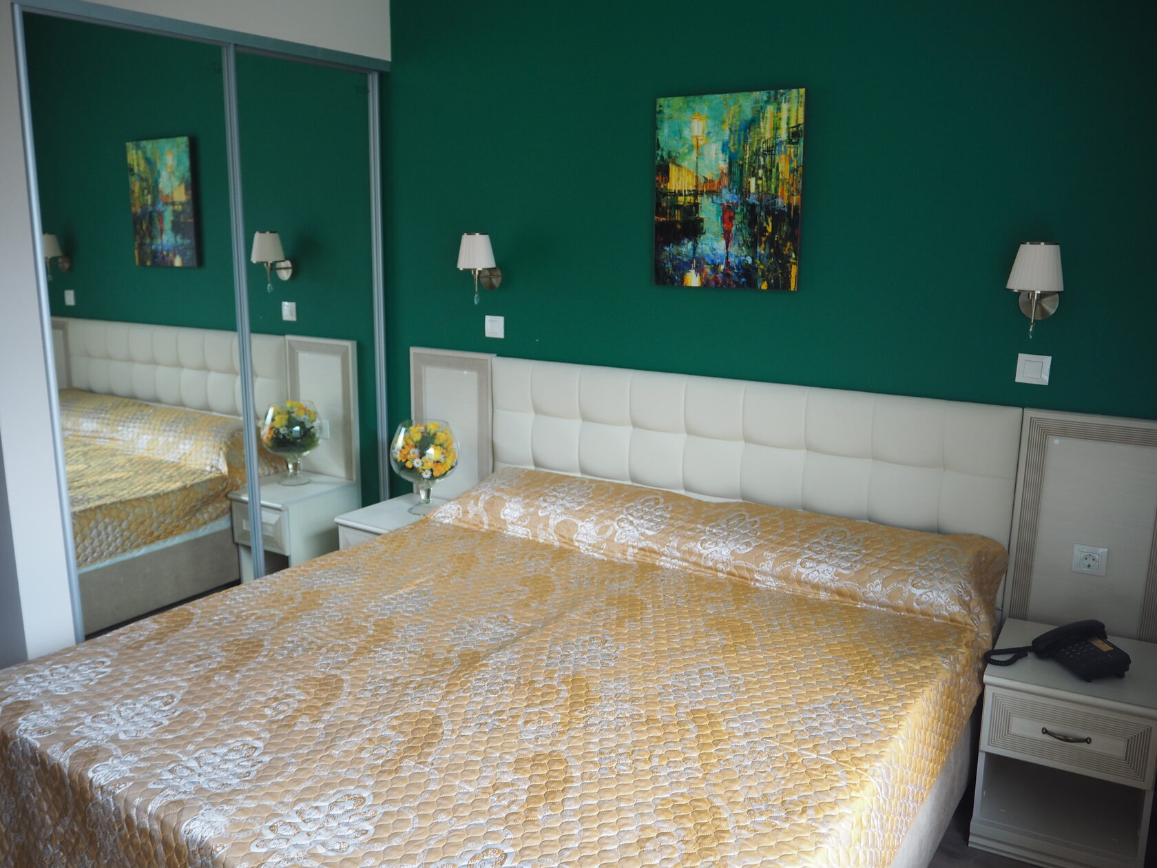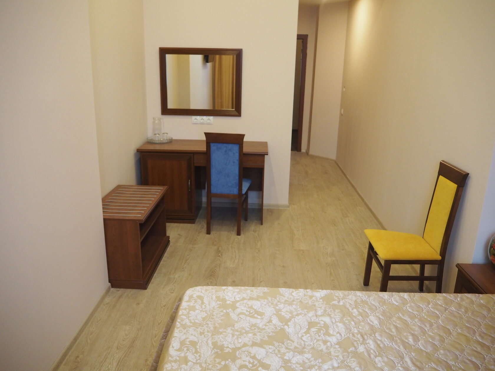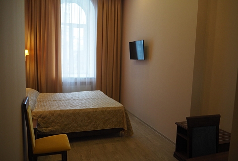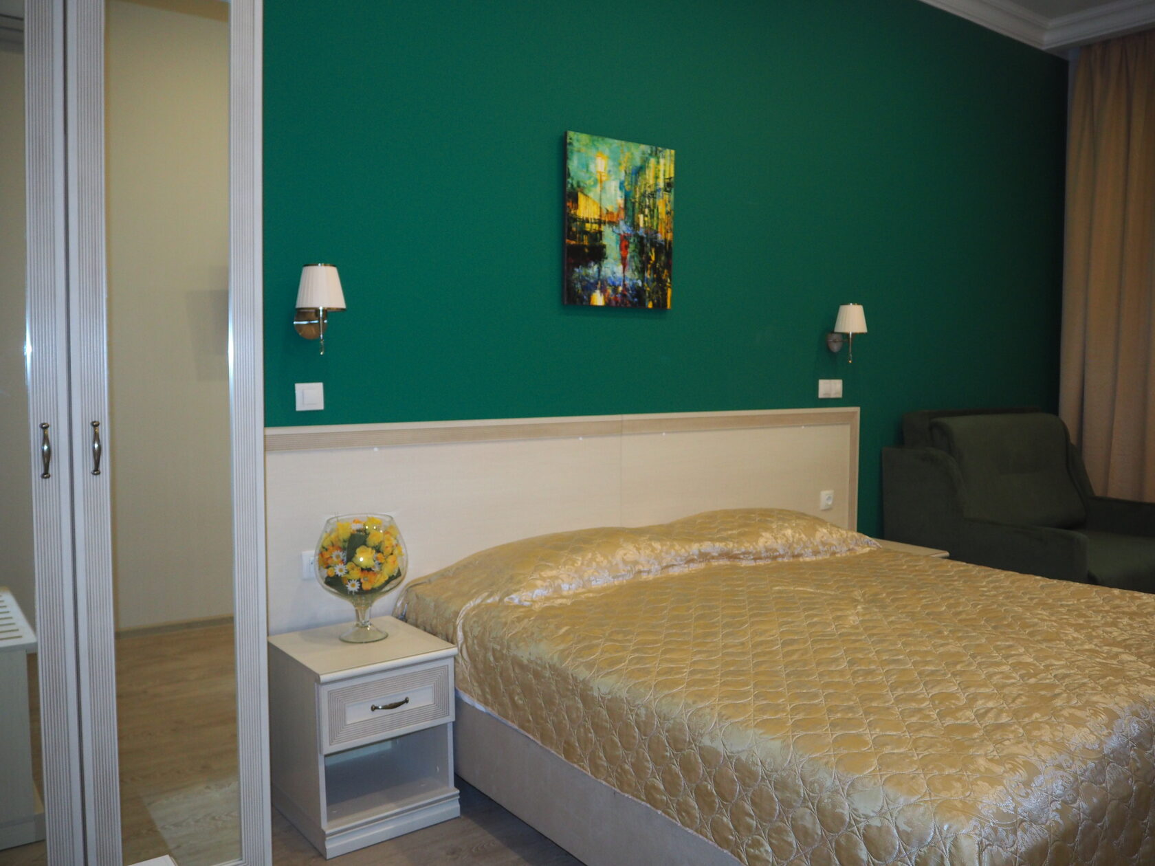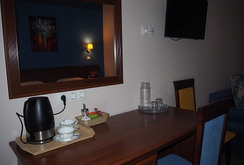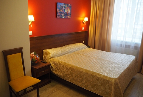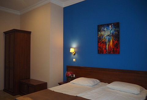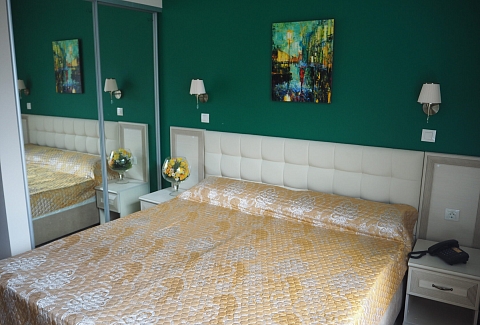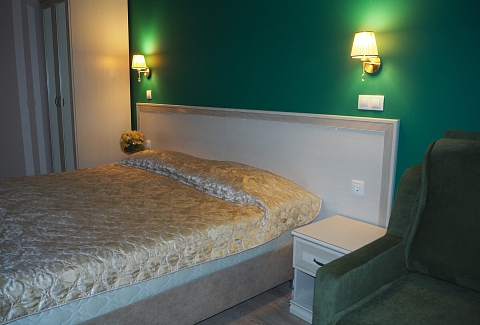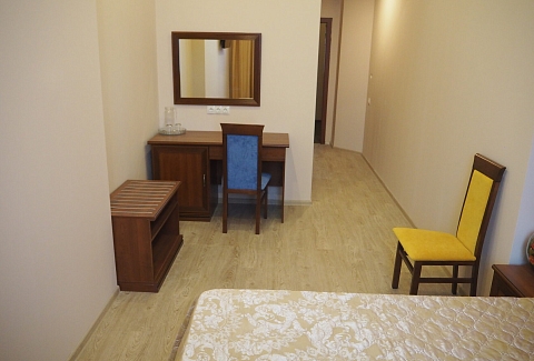 В номере: зеркало, кресло-кровать, кровать двуспальная, прикроватные тумбочки, стол, стулья, шкаф, мини-холодильник, телевизор, телефон, электрочайник
