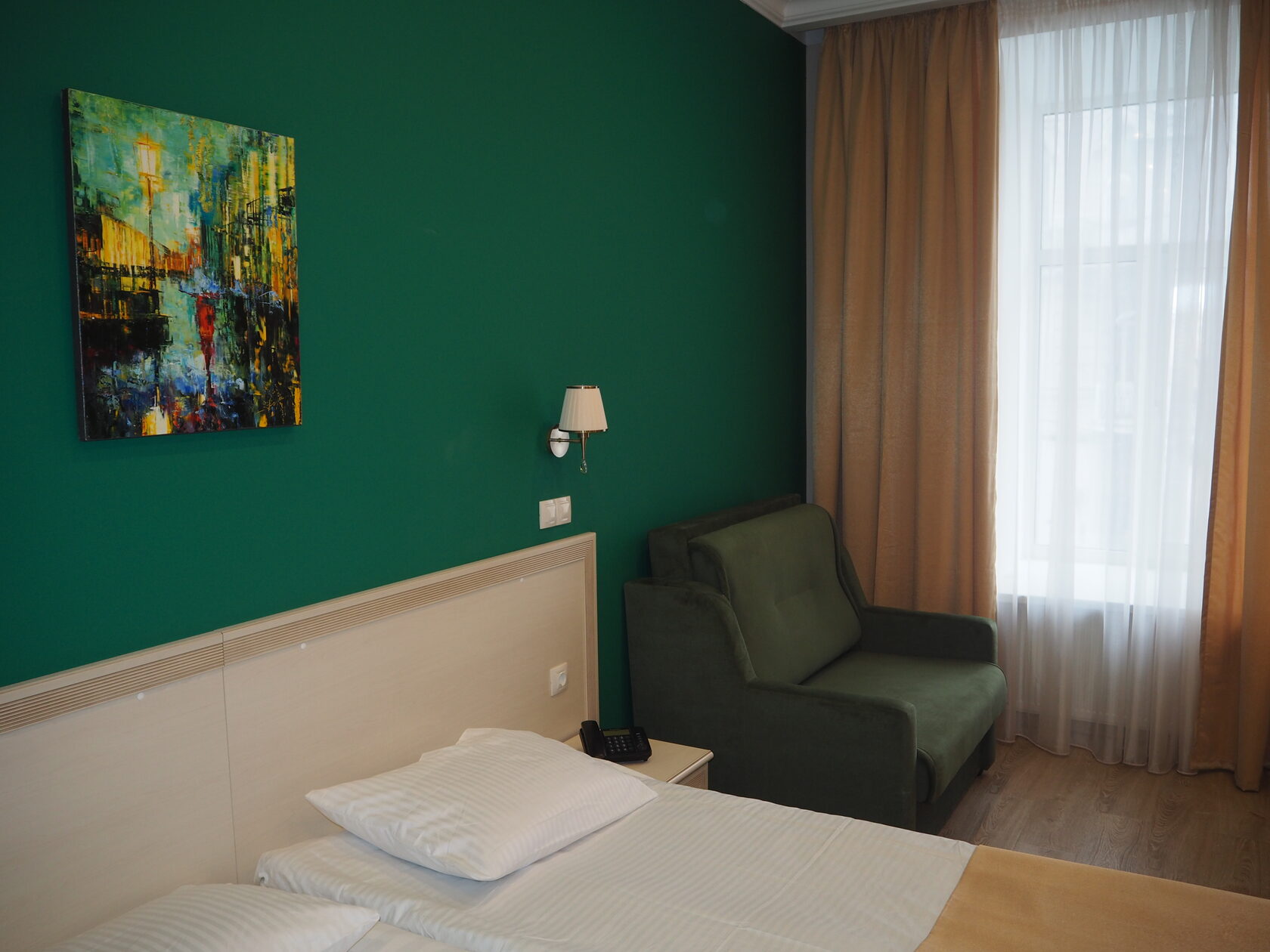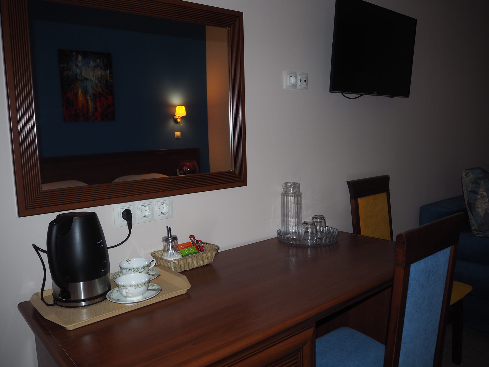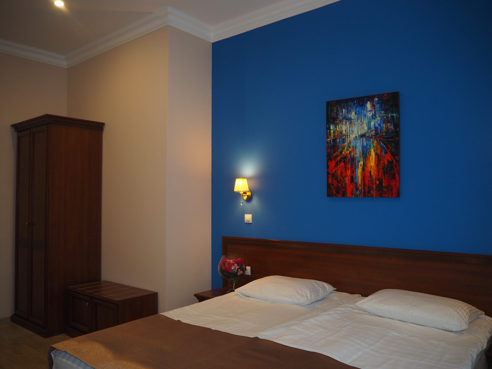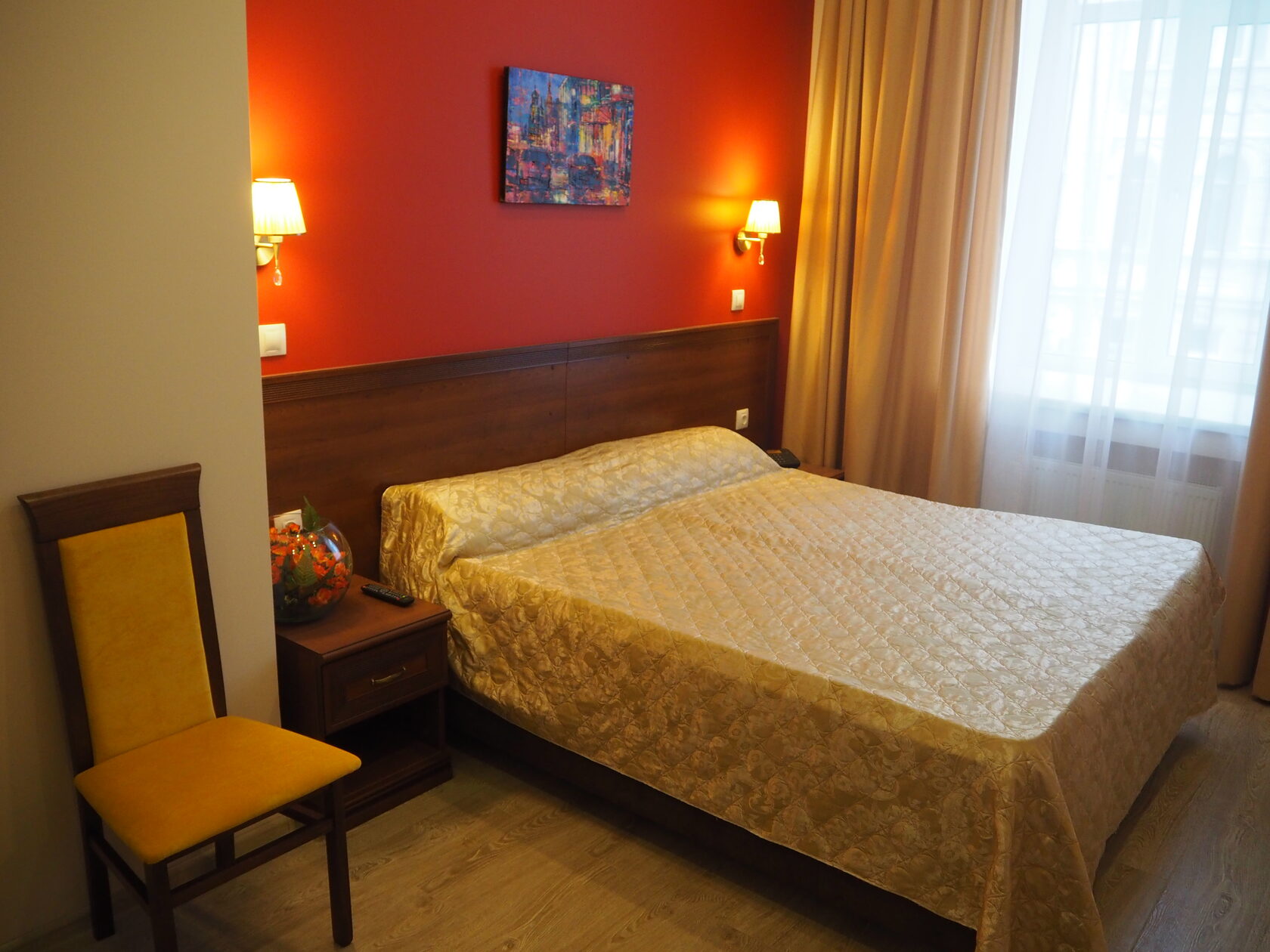 В номере: зеркало, кресло-кровать, кровать двуспальная, прикроватные тумбочки, стол, стулья, шкаф, мини-холодильник, телевизор, телефон, электрочайник
