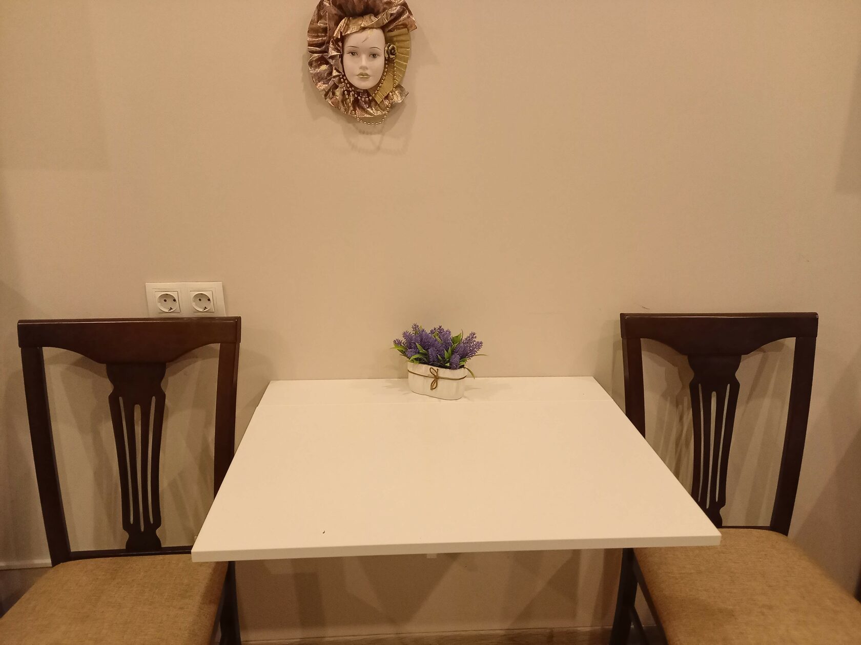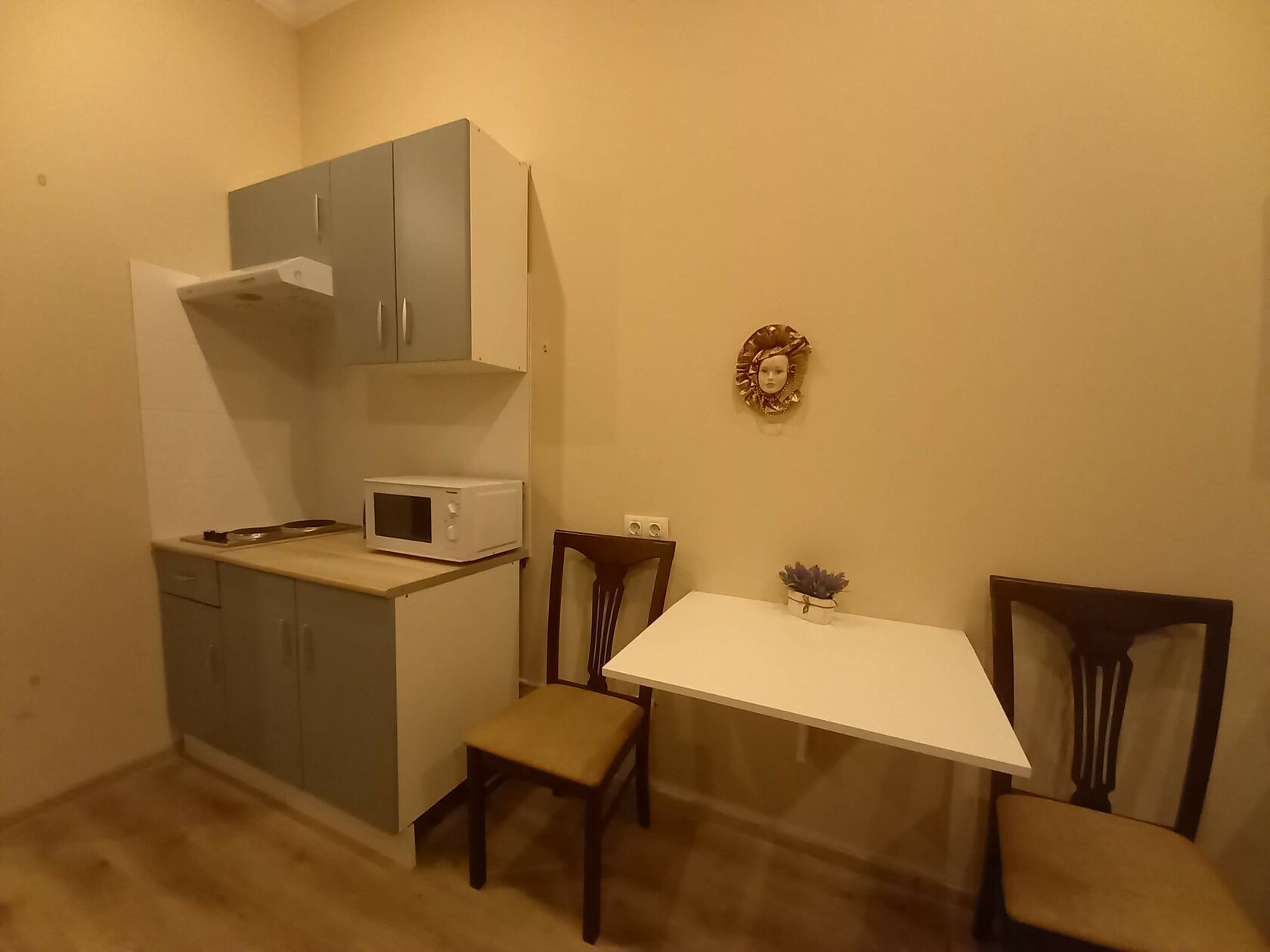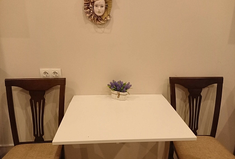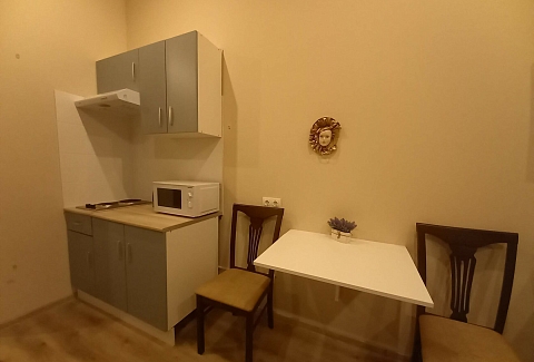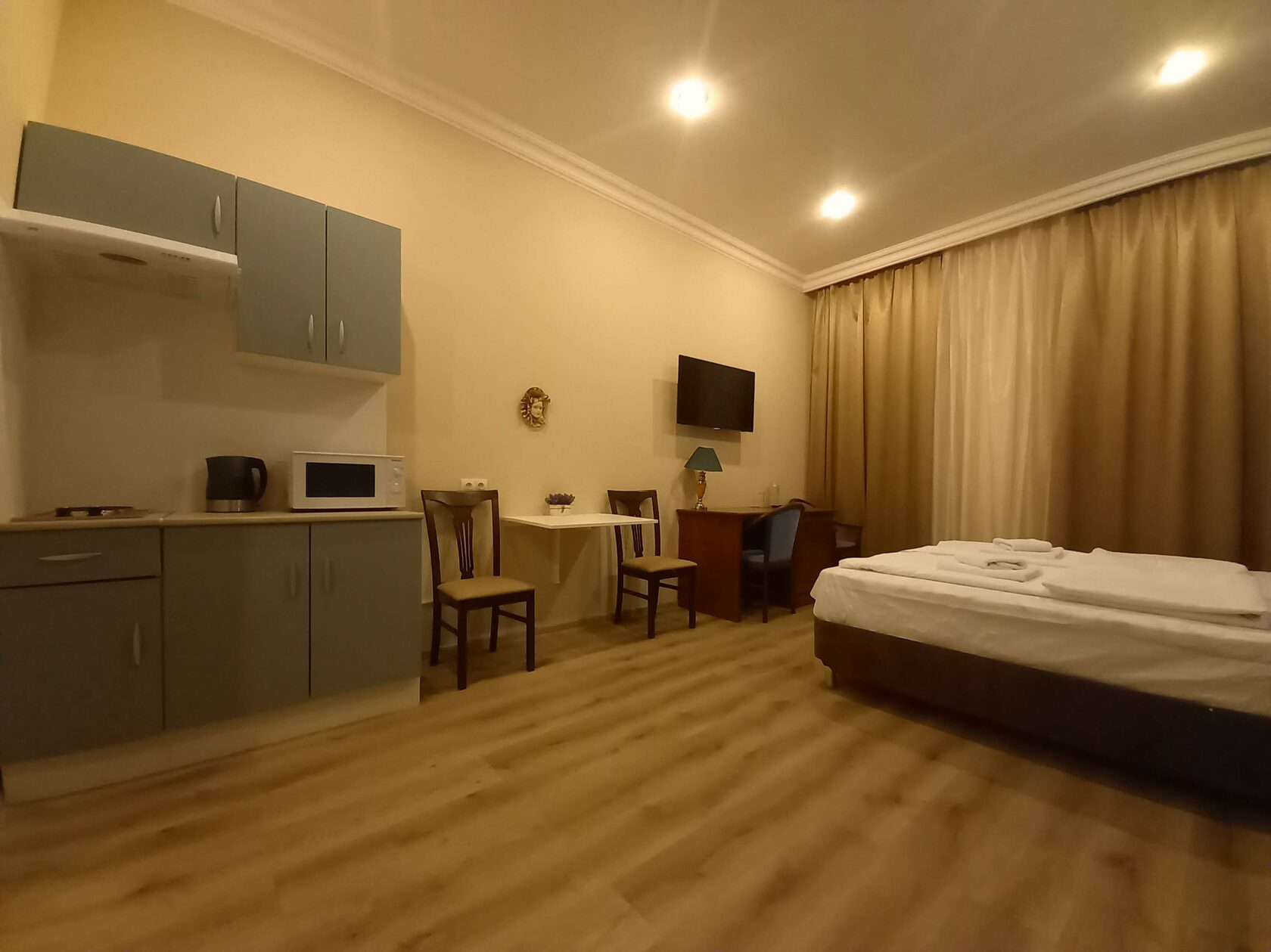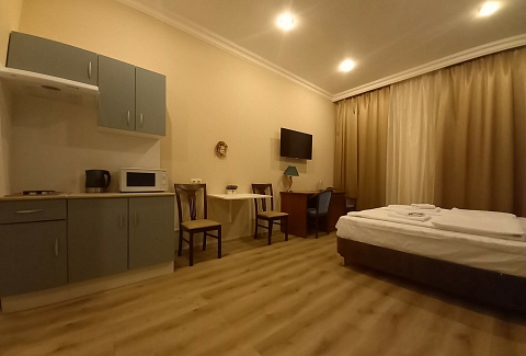 В номере: вешалка, диван, зеркало, кровать двуспальная, прикроватные тумбочки, стол, стулья, шкаф, микроволновая печь, мини-холодильник, набор посуды, плита электрическая, телевизор, электрочайник