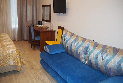 В номере: вешалка, диван, зеркало, кровать двуспальная, прикроватные тумбочки, стол, стулья, шкаф, мини-холодильник, телевизор, телефон, электрочайник