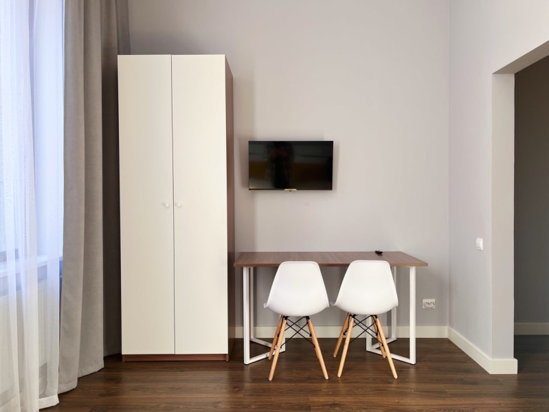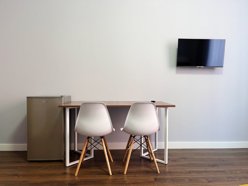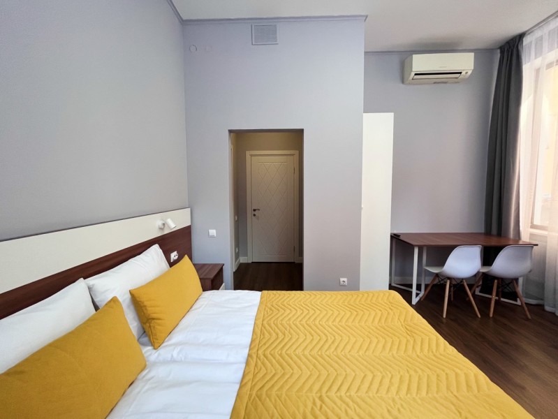 В номере: кровать двуспальная, прикроватные тумбочки, стол, стулья, шкаф, кондиционер, микроволновая печь, мини-холодильник, телевизор, электрочайник