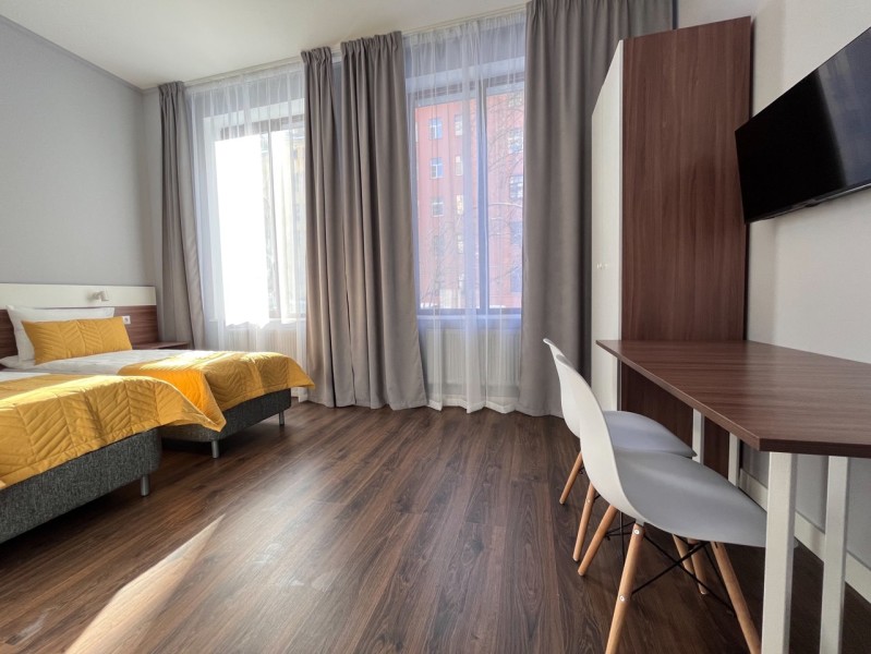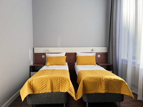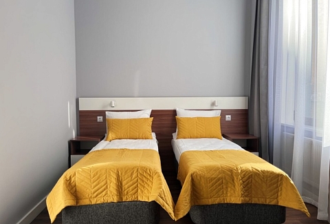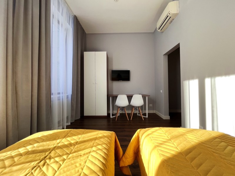 В номере: кровати односпальные, прикроватные тумбочки, стол, стулья, шкаф, кондиционер, микроволновая печь, мини-холодильник, телевизор, электрочайник