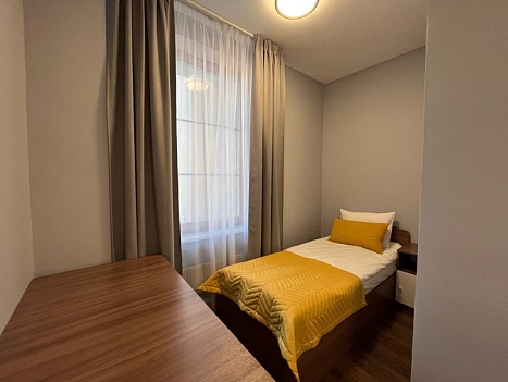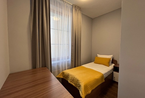 В номере: кровать односпальная, прикроватная тумбочка, стол, шкаф, микроволновая печь, мини-холодильник, телевизор, электрочайник