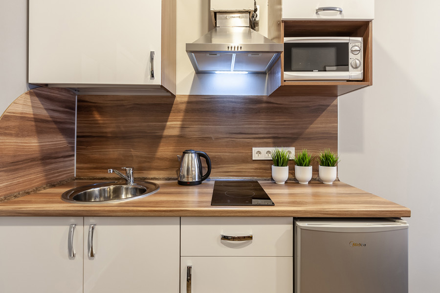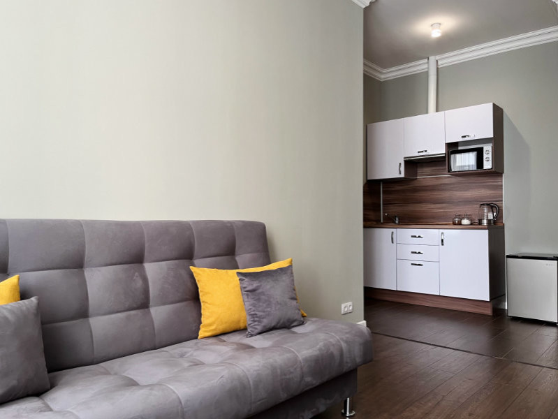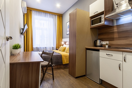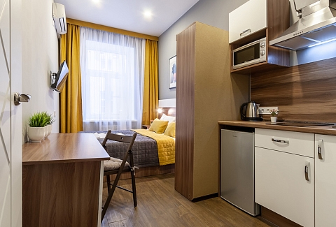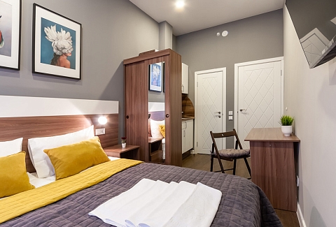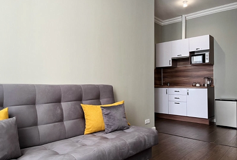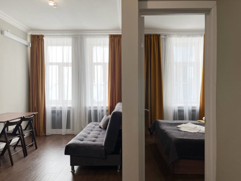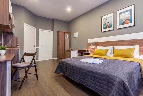 Уютные студии с современным дизайном располагаются в историческом здании — бывшем доходном доме купца Михайлова. Спальные зоны укомплектованы большой двуспальной кроватью и телевизором. В кухонных зонах оборудовано рабочее пространство для приготовления еды и обеденная группа. В санузлах установлена душевая кабина. Есть вся необходимая техника, включая стиральную машину. Можно подключиться к Wi-Fi.