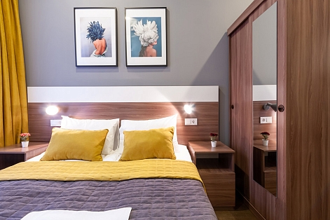 В номере: вешалка, зеркало, кровать двуспальная, прикроватные тумбочки, стулья, шкаф, кондиционер, микроволновая печь, набор посуды, плита электрическая, стиральная машина, телевизор, холодильник, электрочайник