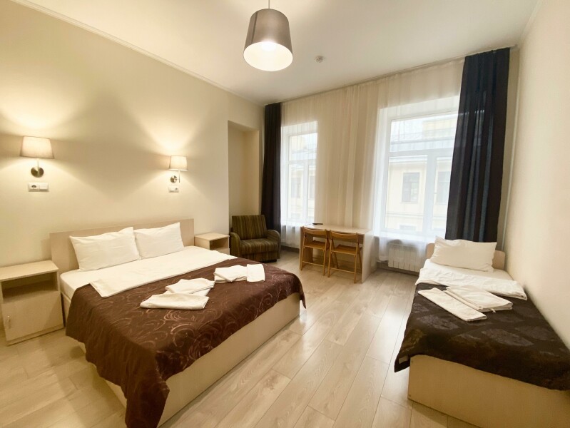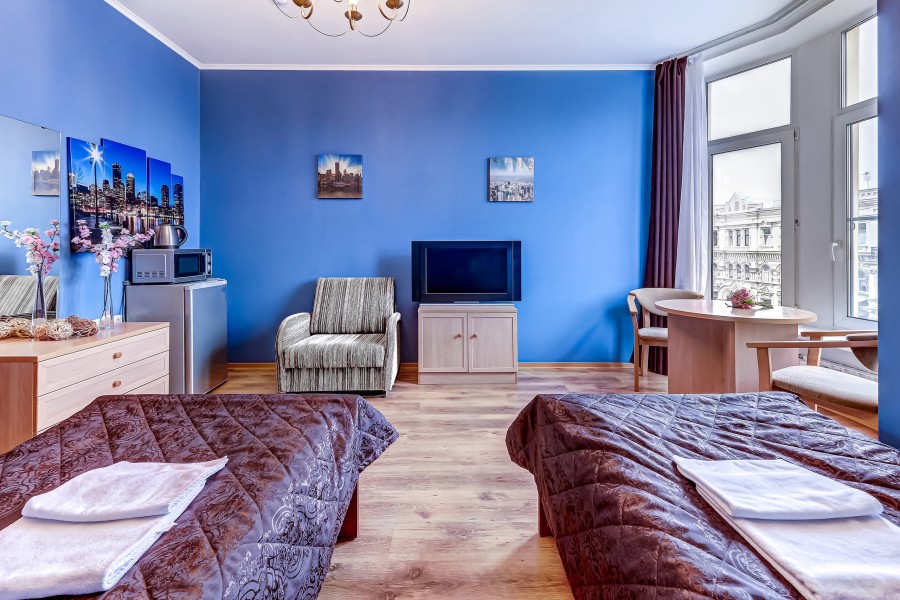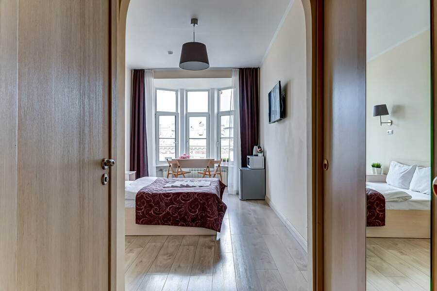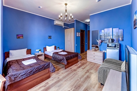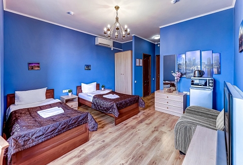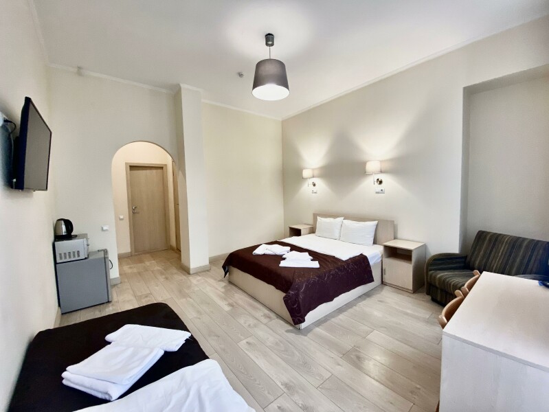 В номере: вешалка, зеркало, кресло, кровать двуспальная, кровать односпальная, прикроватные тумбочки, стол, стулья, шкаф, микроволновая печь, мини-холодильник, телевизор, электрочайник