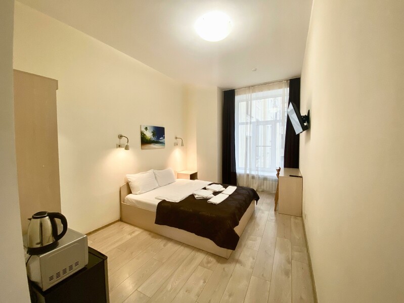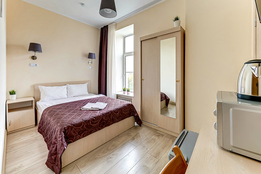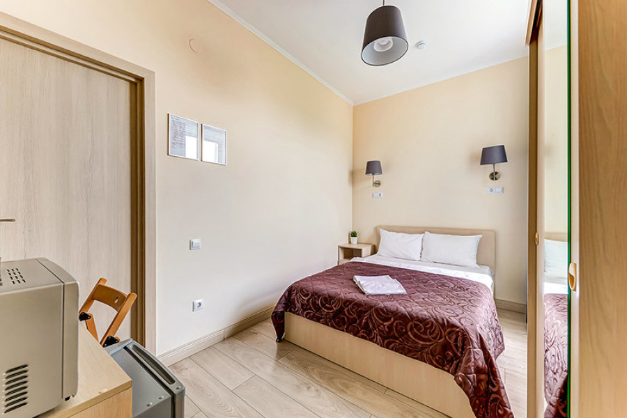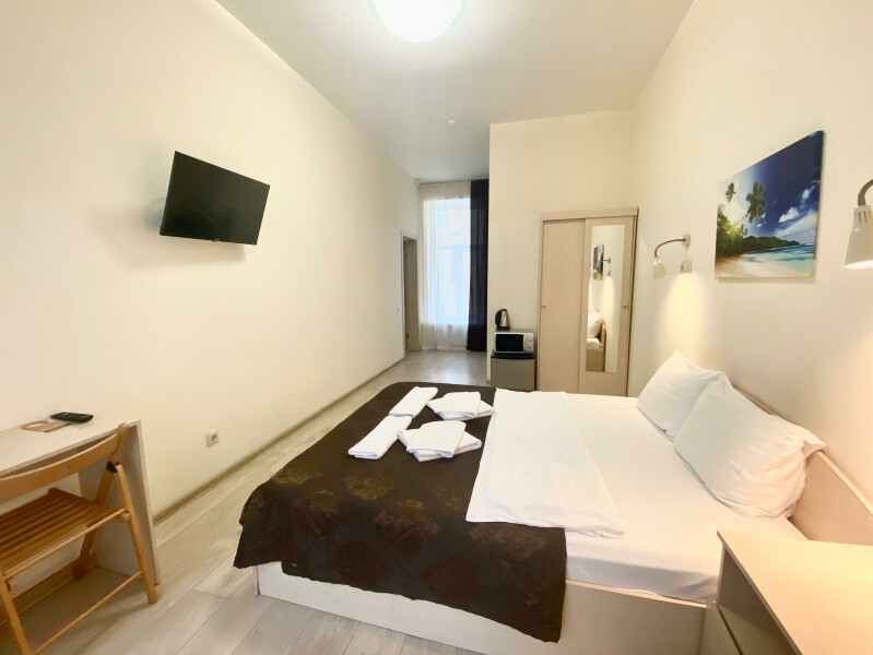 В номере: зеркало, кровать двуспальная, стол, стул, шкаф, микроволновая печь, мини-холодильник, телевизор, электрочайник