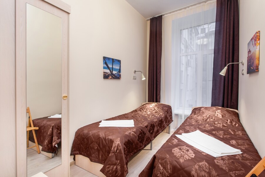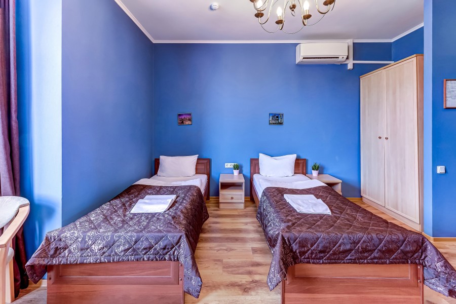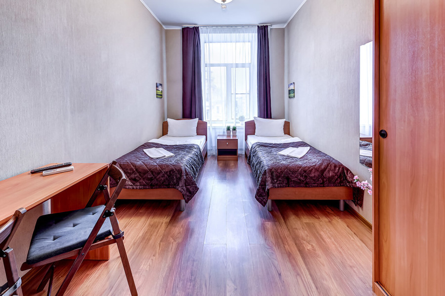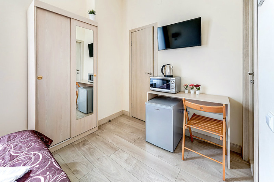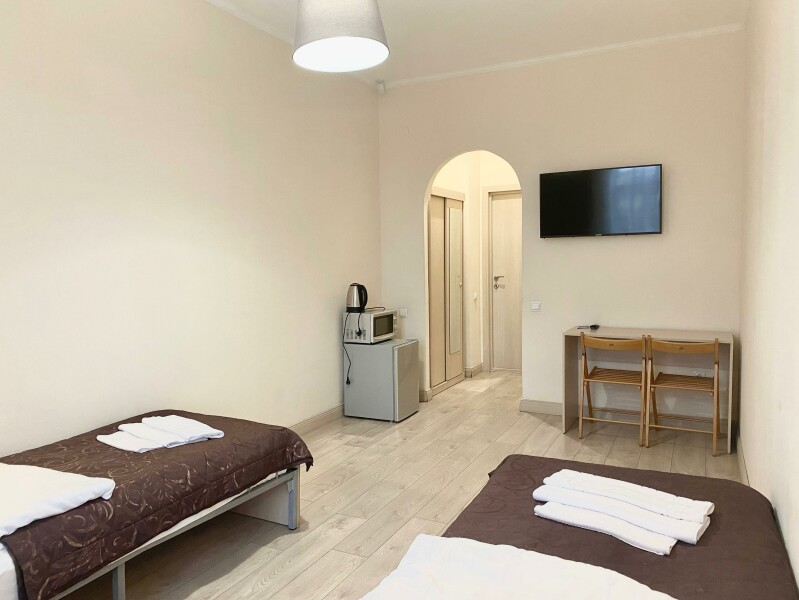 В номере: зеркало, комод, кресло-кровать, кровати односпальные, стол, стулья, шкаф, микроволновая печь, мини-холодильник, телевизор, электрочайник