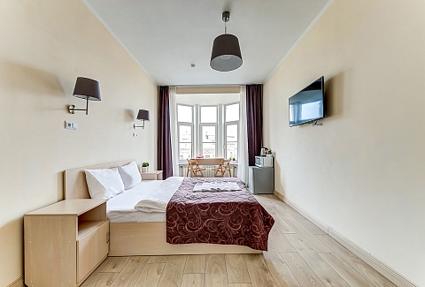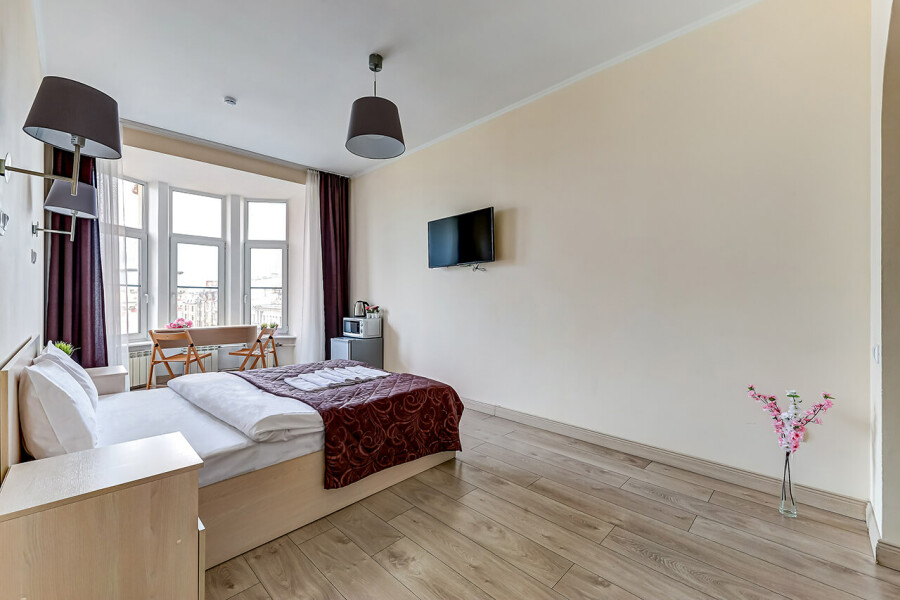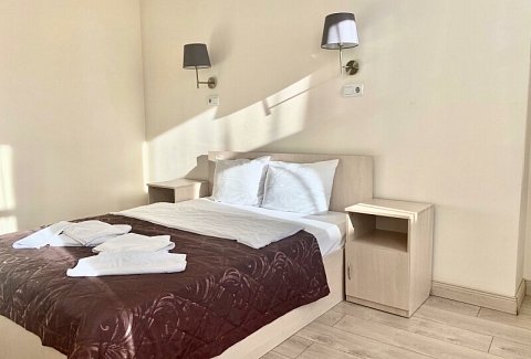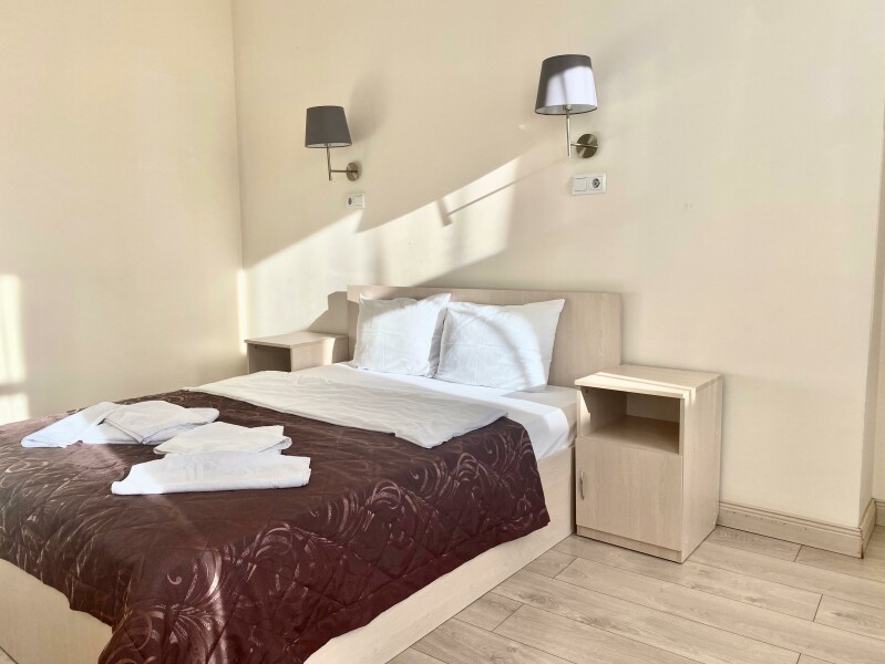 В номере: вешалка, зеркало, кровать двуспальная, прикроватные тумбочки, стол, стулья, шкаф, микроволновая печь, мини-холодильник, телевизор, электрочайник