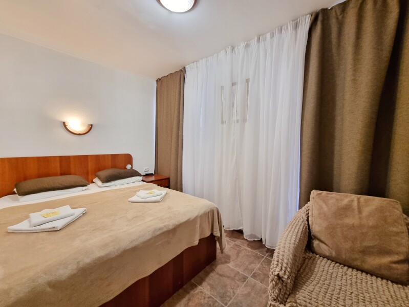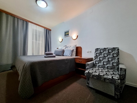 В номере: вешалка, зеркало, кресло-кровать, кровать двуспальная, прикроватные тумбочки, стол, стул, шкаф, телевизор, холодильник