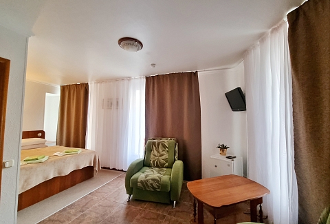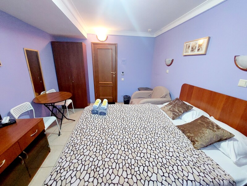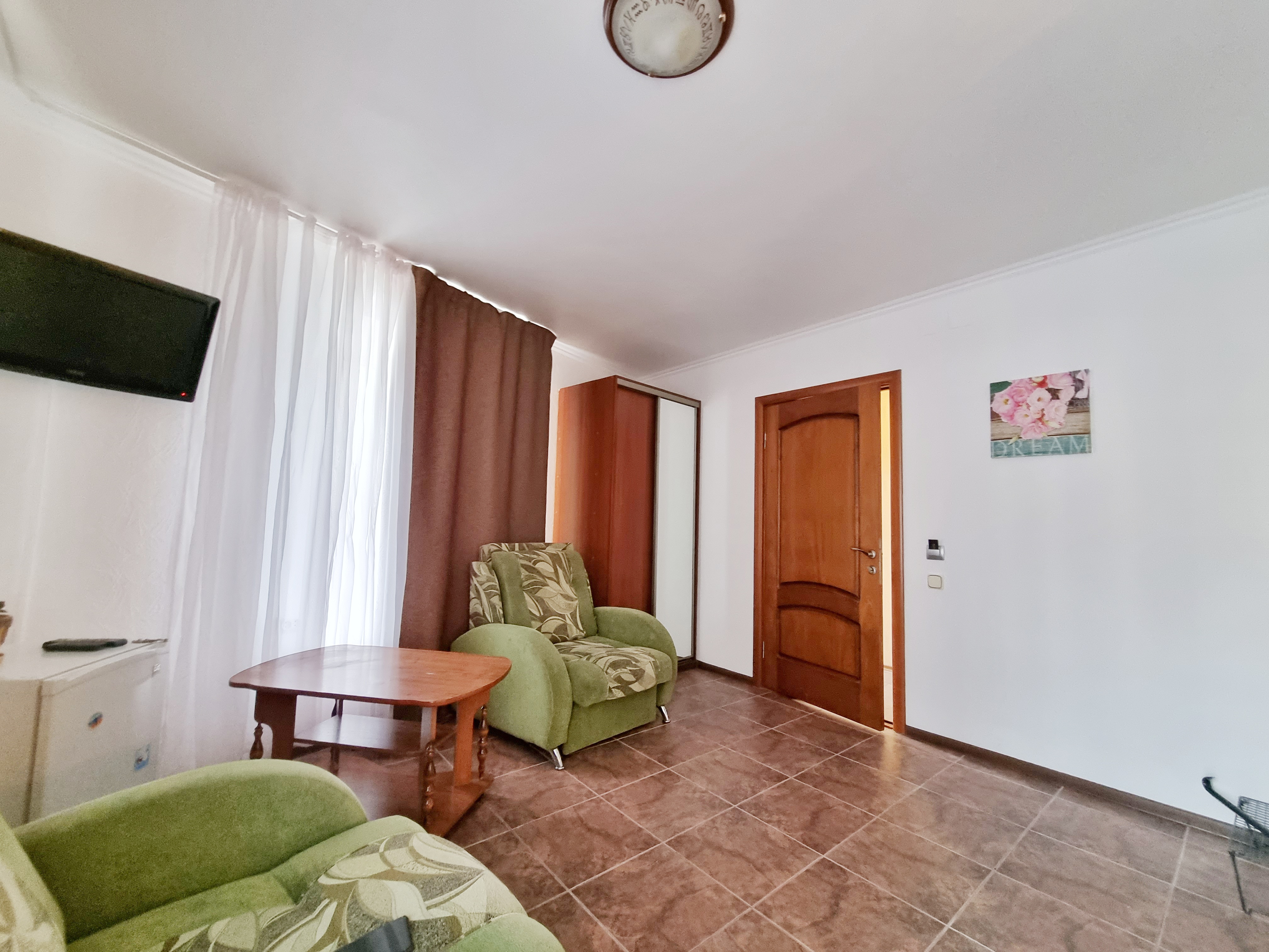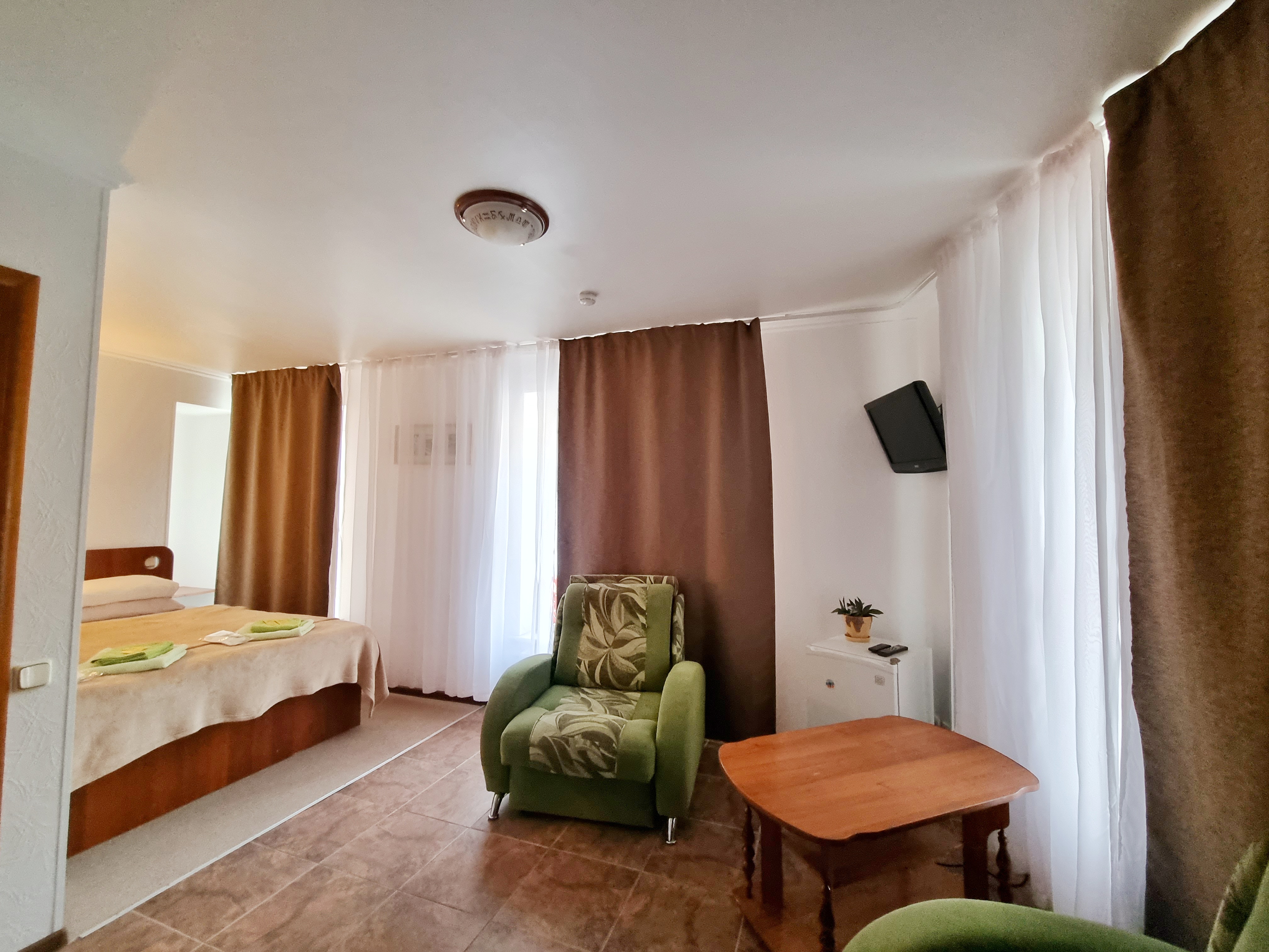 В номере: диван раскладной, кресло-кровать, кровать двуспальная, прикроватные тумбочки, стол, стул, шкаф, телевизор, холодильник