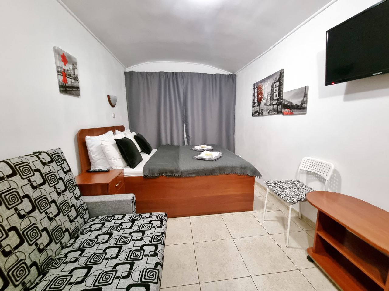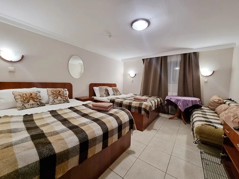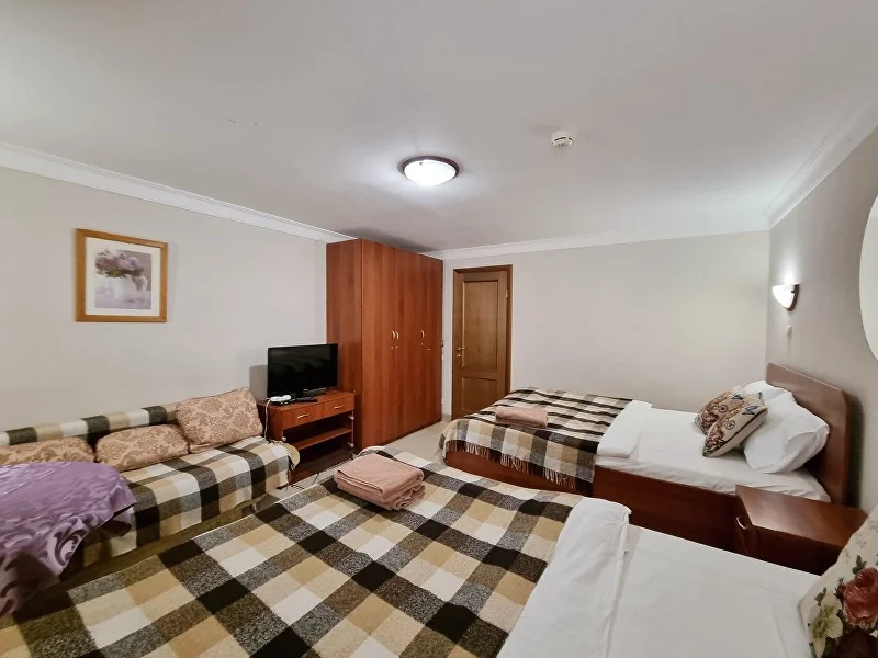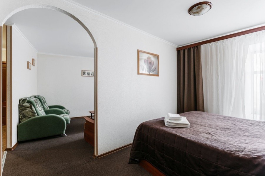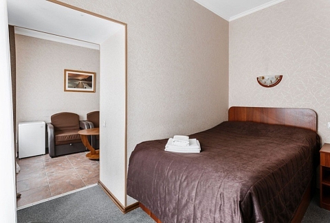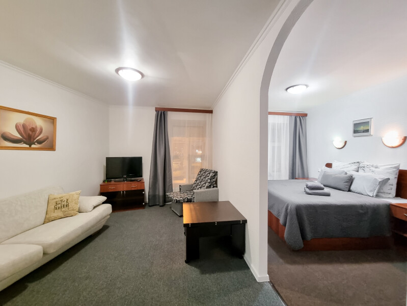 В номере: диван раскладной, кресло-кровать, кровать двуспальная, прикроватные тумбочки, стол, стул, шкаф, телевизор, холодильник