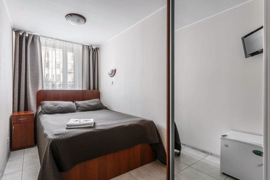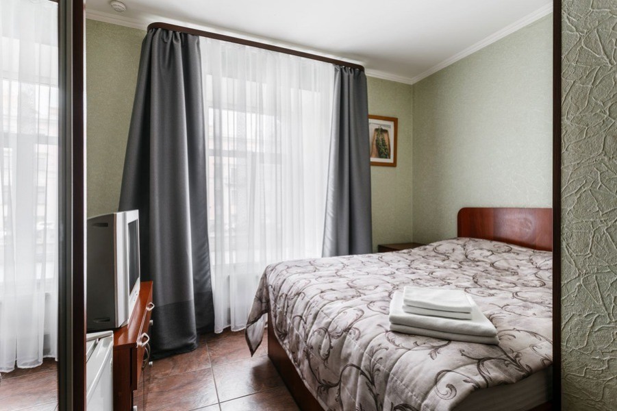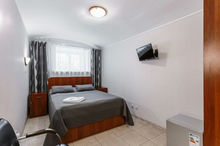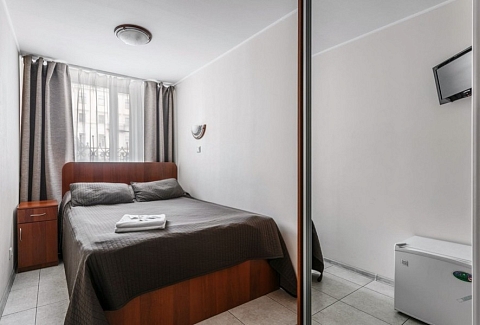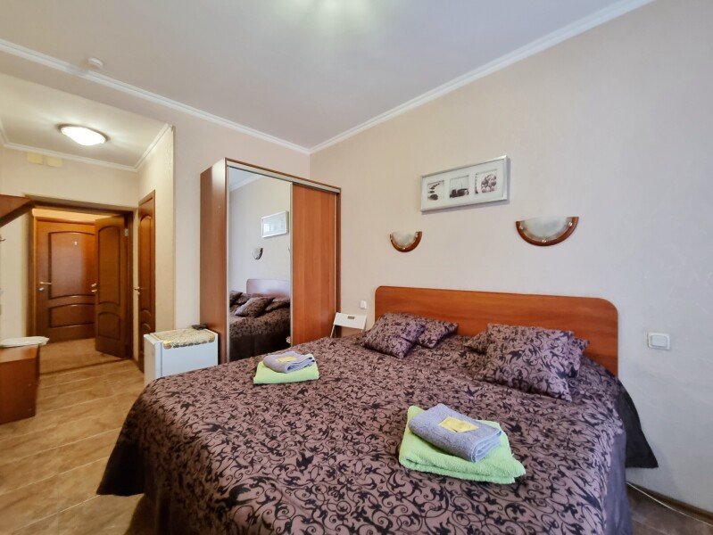 В номере: зеркало, кровать двуспальная, прикроватные тумбочки, стол, стул, шкаф, телевизор, холодильник