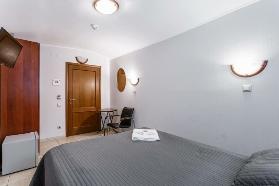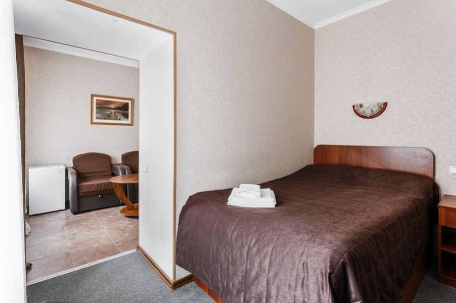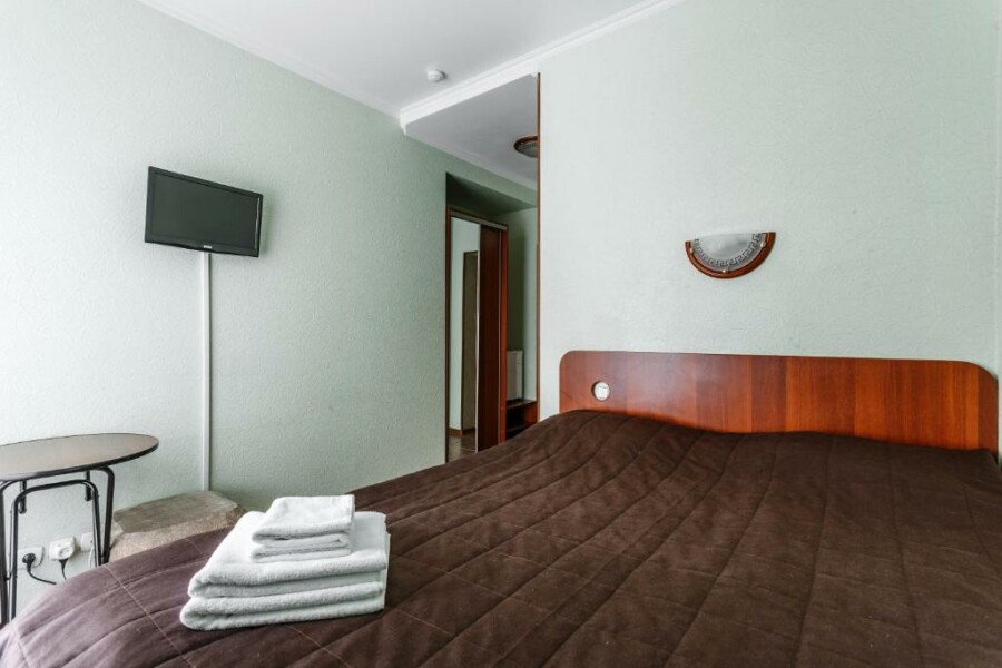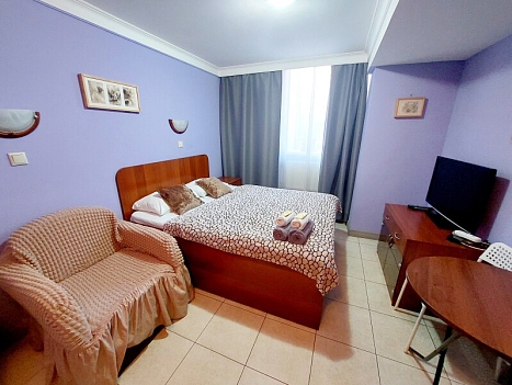 В номере: вешалка, зеркало, кресло-кровать, кровать двуспальная, стол, стул, шкаф, телевизор, холодильник