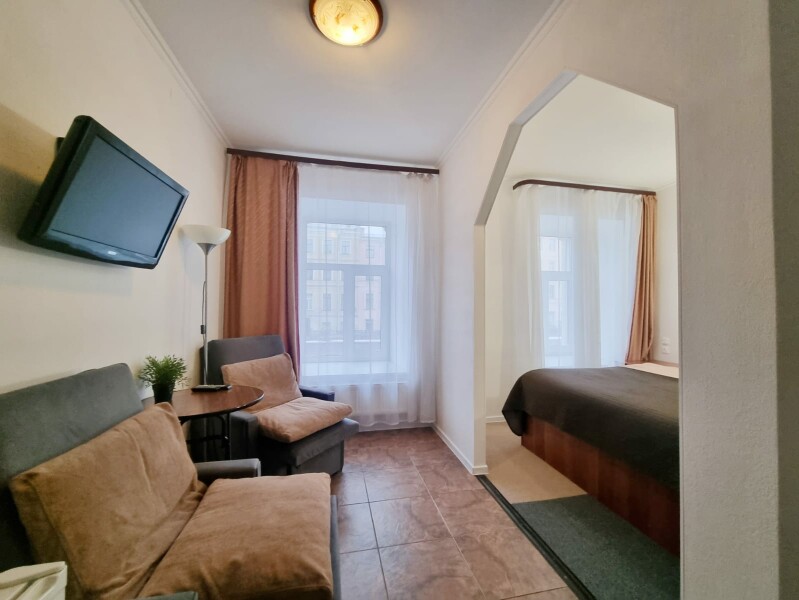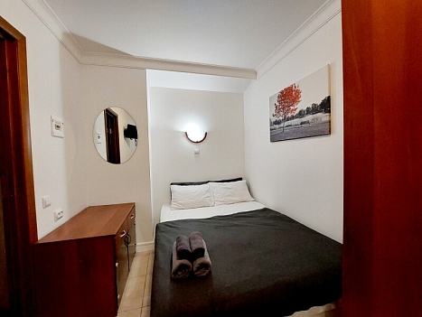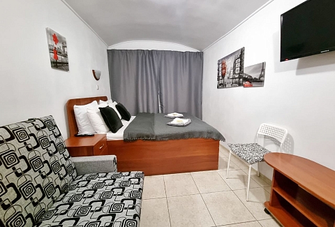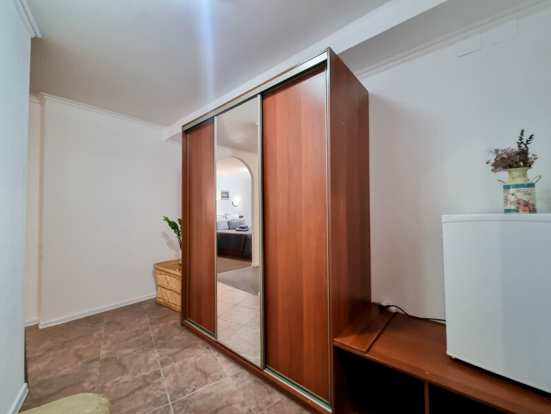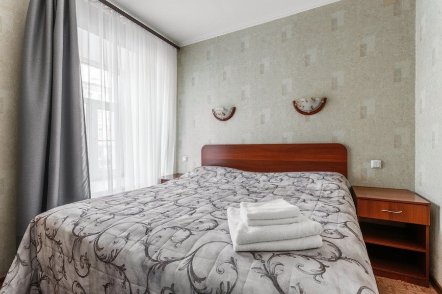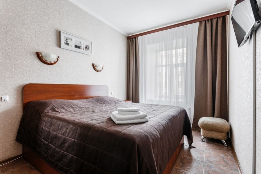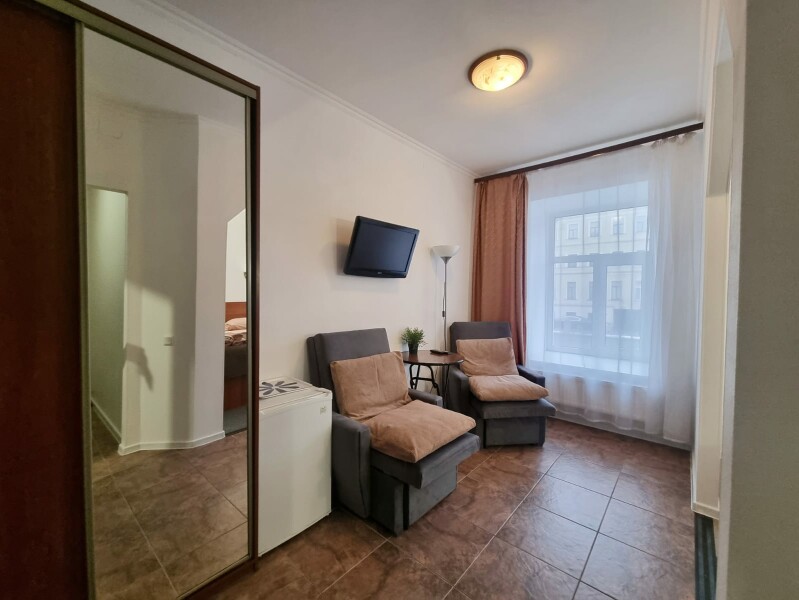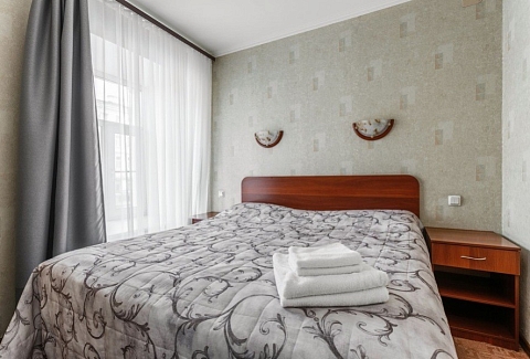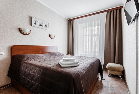 В номере: вешалка, диван раскладной, зеркало, кровать двуспальная, прикроватные тумбочки, стол, стул, шкаф, телевизор, холодильник