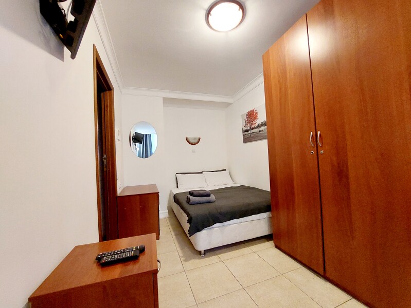 В номере: вешалка, зеркало, кровать двуспальная, прикроватные тумбочки, стол, стул, шкаф, телевизор, холодильник
