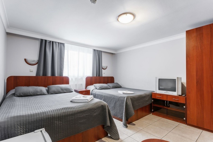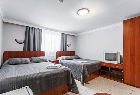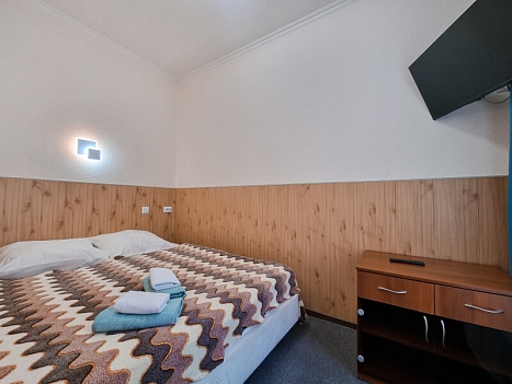 В номере: вешалка, зеркало, кровать двуспальная, кровать двухъярусная, прикроватные тумбочки, стол, стул, шкаф, телевизор, холодильник