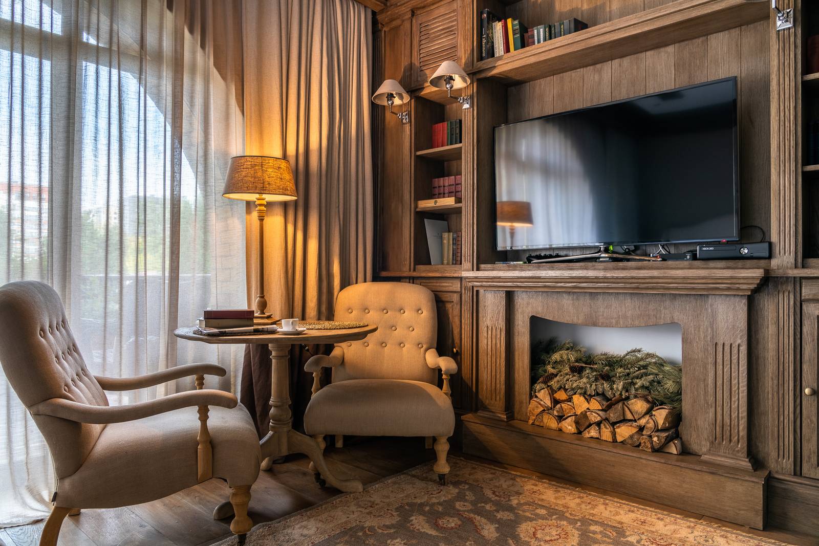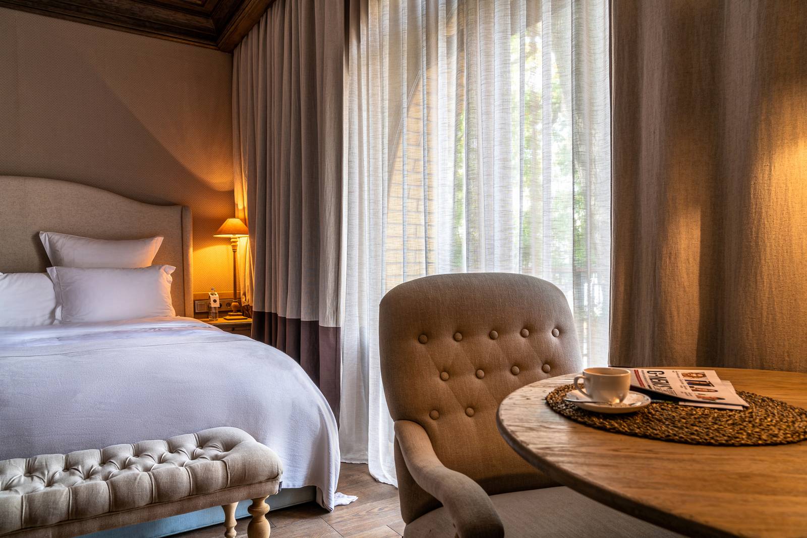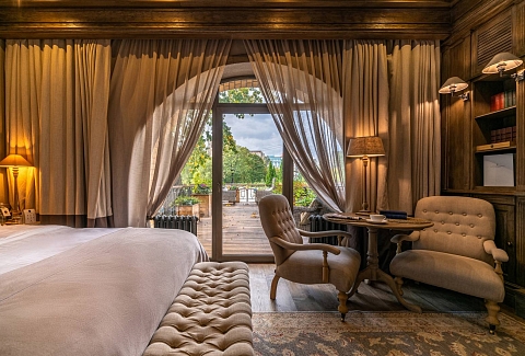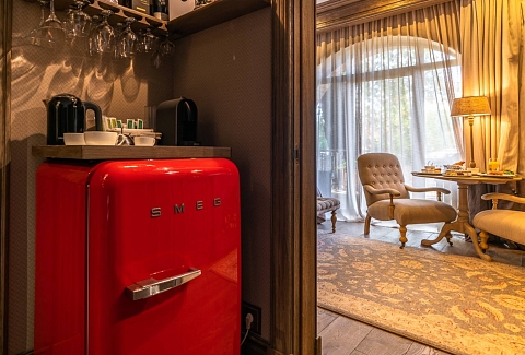В номере: вешалка, зеркало, кровать двуспальная, стол, стулья, шкаф, кондиционер, кофемашина, мини-холодильник, сейф, телевизор, электрочайник