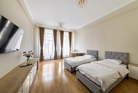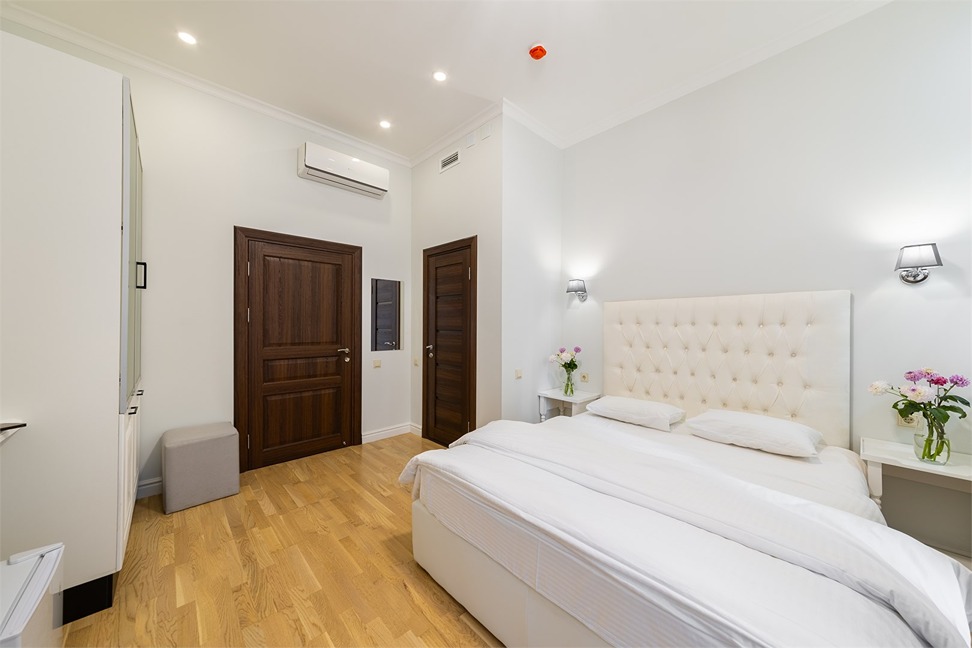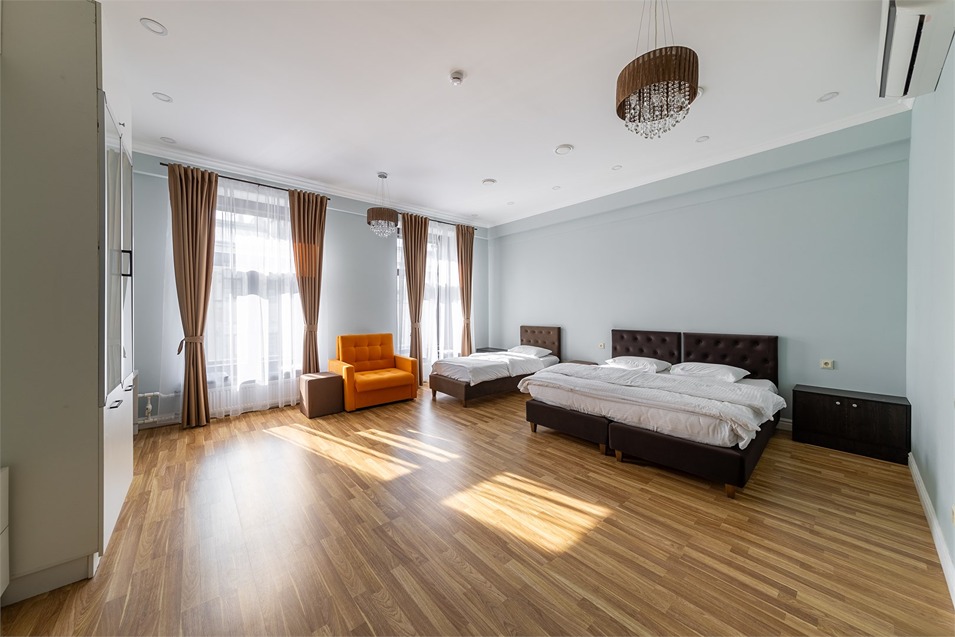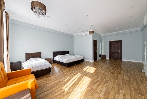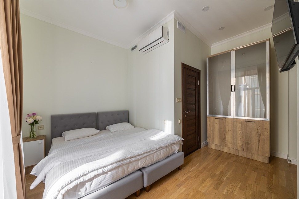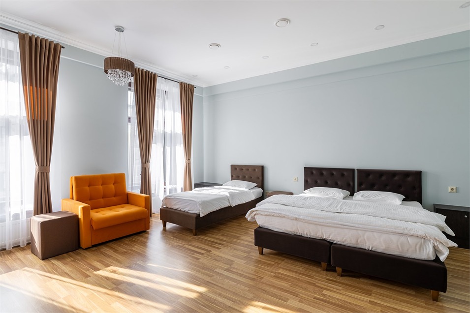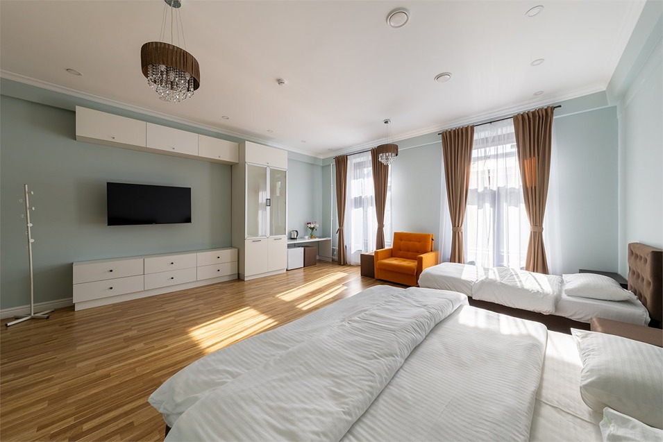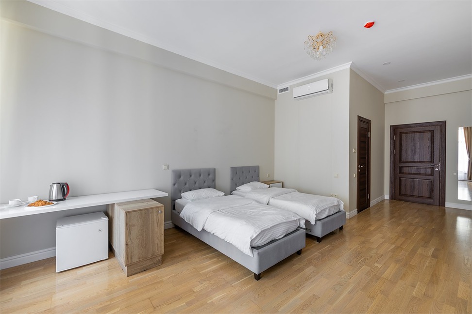 В номере: вешалка, диван раскладной, зеркало, кровать двуспальная, кровать односпальная, прикроватные тумбочки, стол, шкаф, кондиционер, мини-холодильник, телевизор, чайный набор посуды, электрочайник