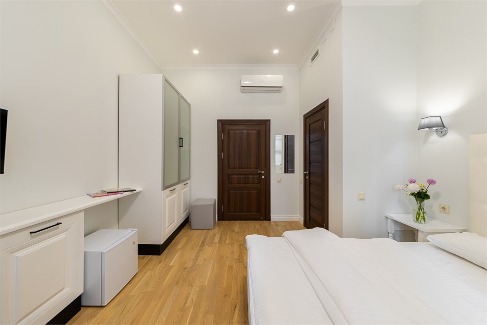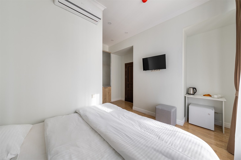 В номере: вешалка, зеркало, кровать двуспальная, прикроватные тумбочки, стол, шкаф, кондиционер, мини-холодильник, телевизор, чайный набор посуды, электрочайник