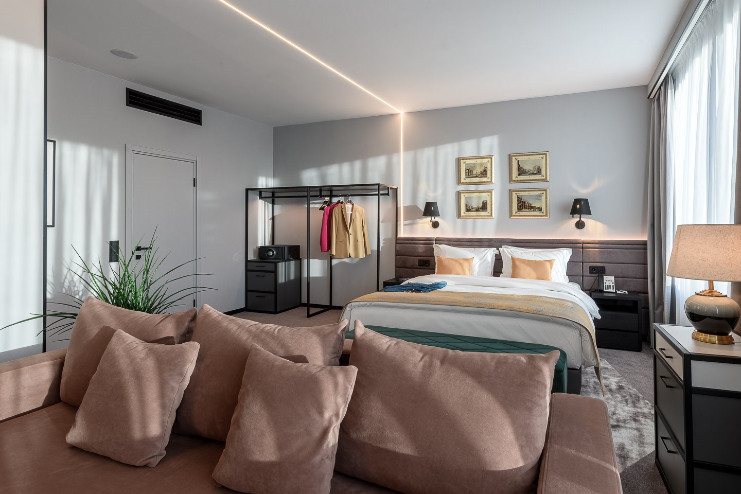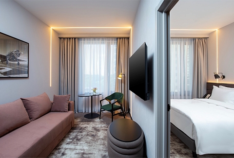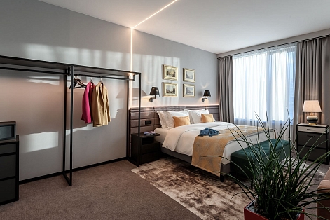 В номере: вешалка, гардеробная, диван, зеркало, кровать двуспальная, прикроватные тумбочки, пуфик, стол, стул, шкаф, гладильная доска, кондиционер, кофемашина, мини-холодильник, сейф, телевизор ЖК, утюг, чайная станция