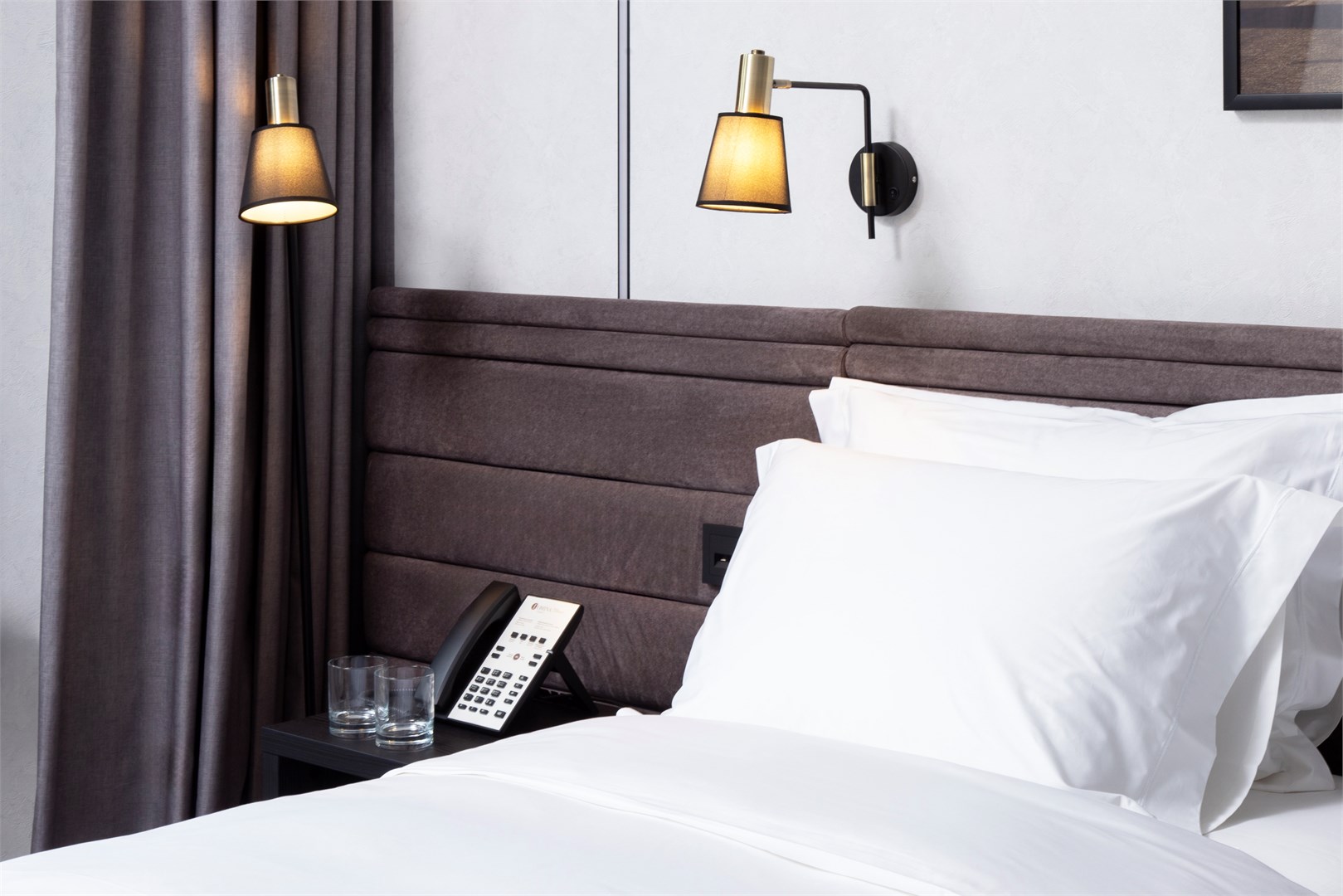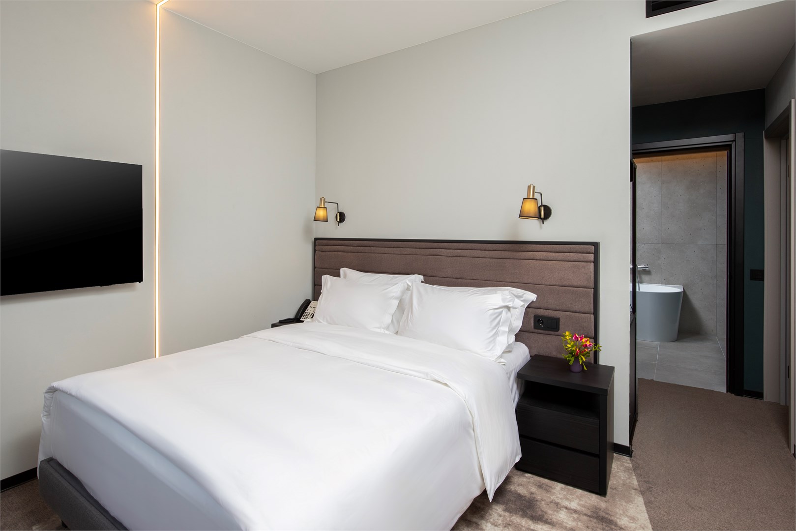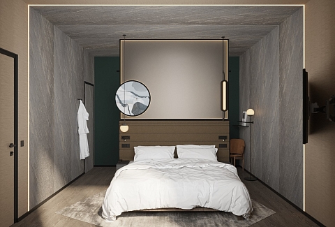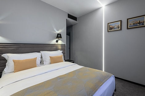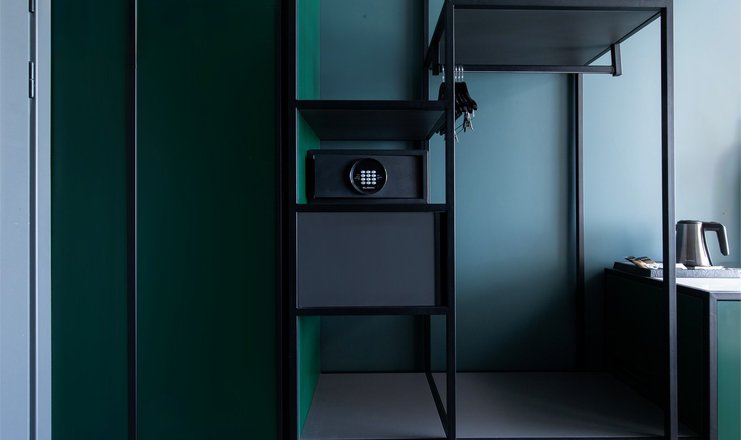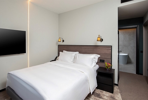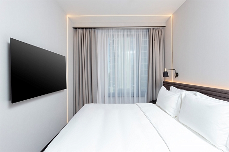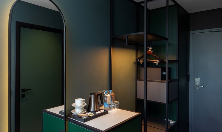 В номере: вешалка, зеркало, кровать двуспальная, прикроватные тумбочки, стол, стул, шкаф, гладильная доска, кондиционер, мини-холодильник, сейф, телевизор, телефон, утюг, чайный набор посуды, электрочайник