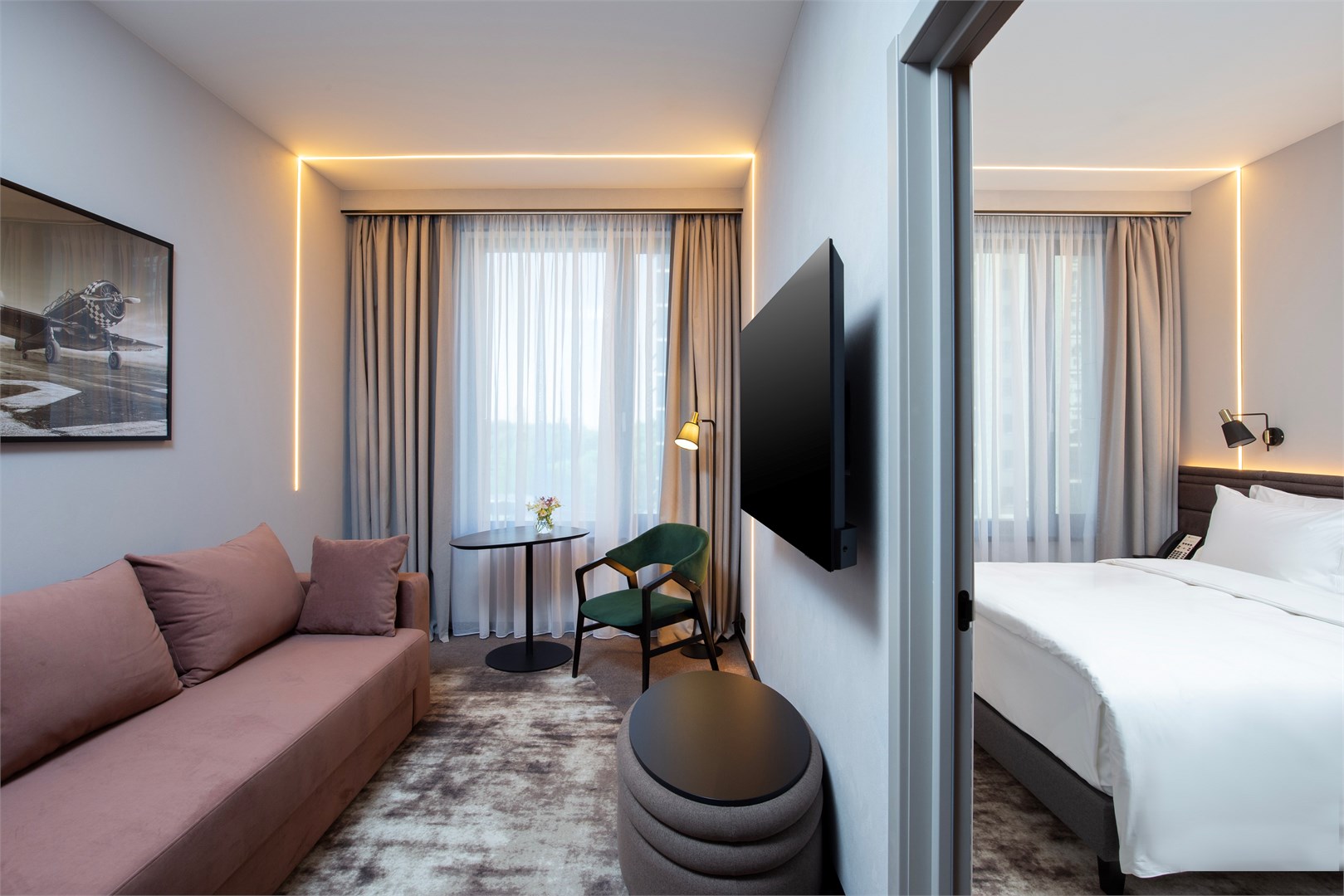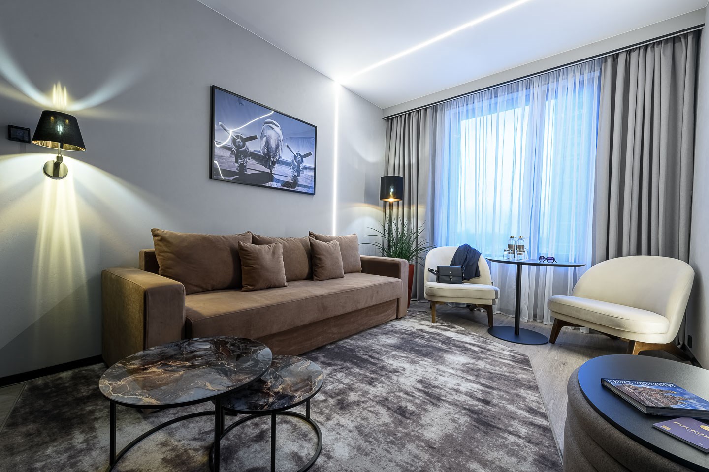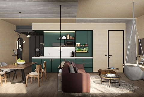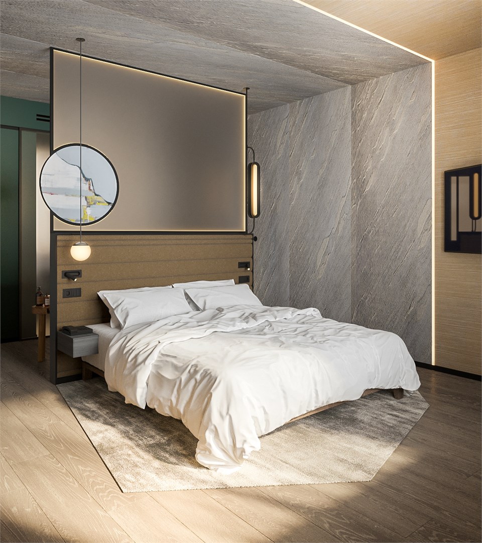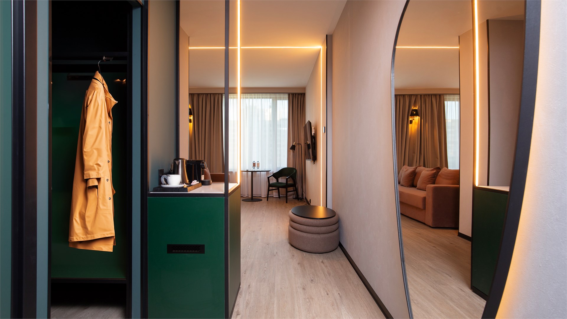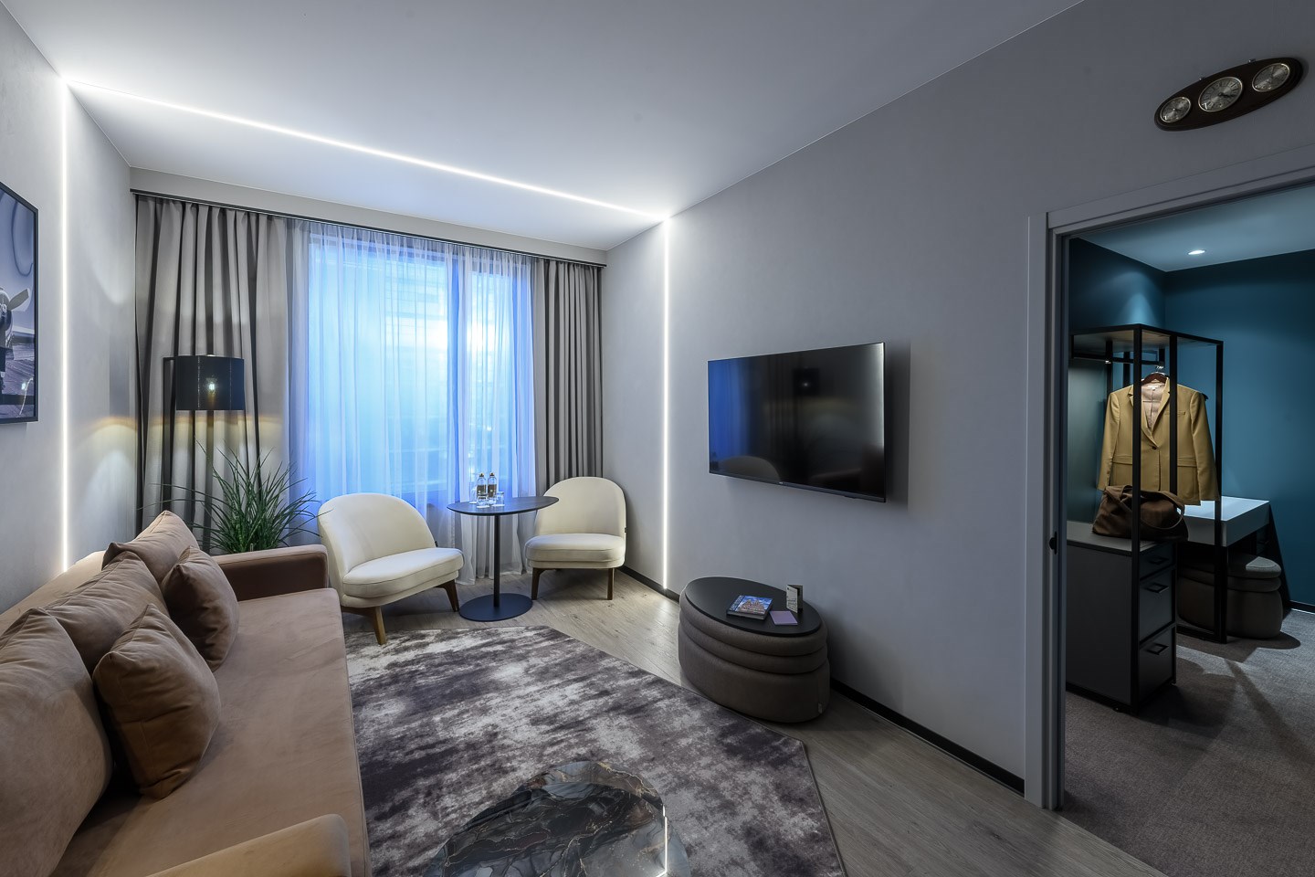 В номере: вешалка, гардеробная, диван, зеркало, качели подвесные, кровать двуспальная, прикроватные тумбочки, пуфик, стол, столик журнальный, столик кофейный, стулья, шкаф, гладильная доска, кондиционер, кофемашина, микроволновая печь, мини-холодильник, сейф, телевизор ЖК, утюг, чайная станция