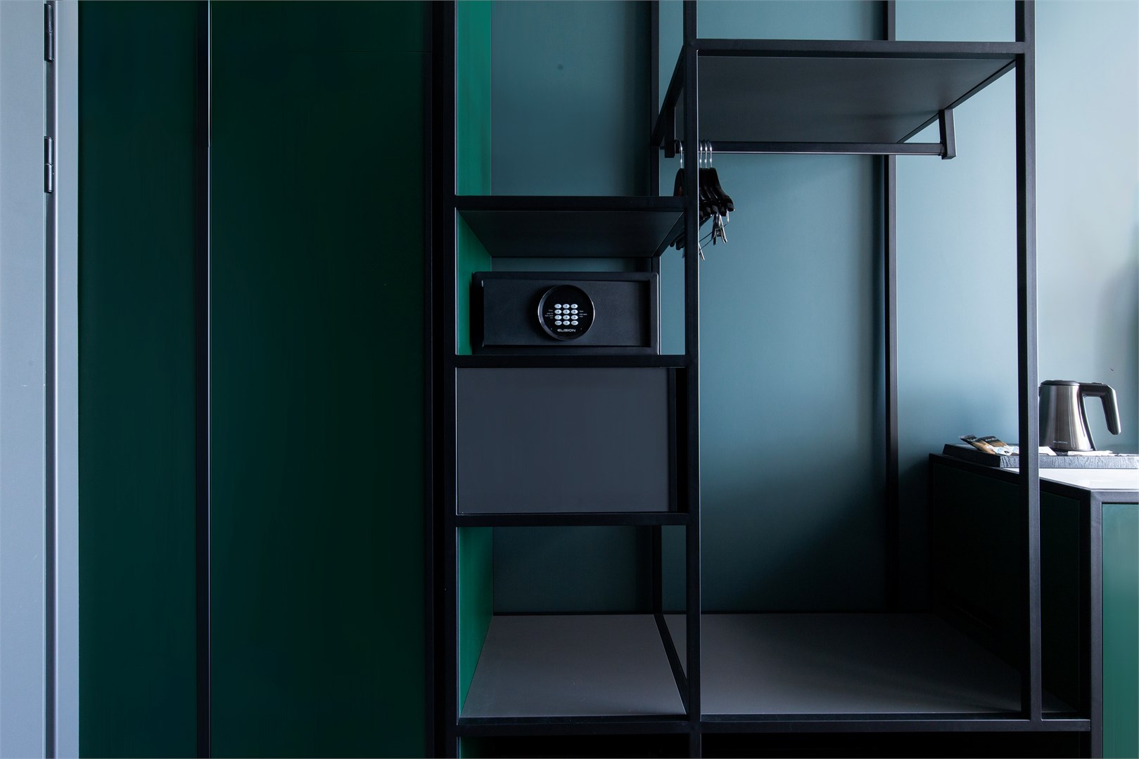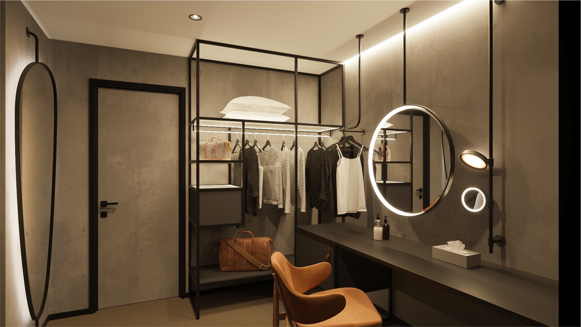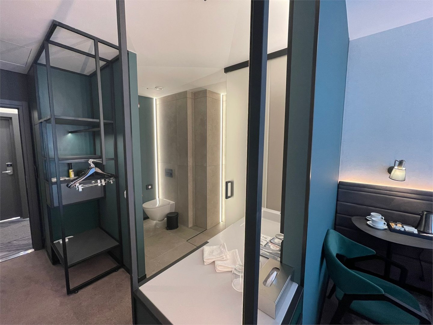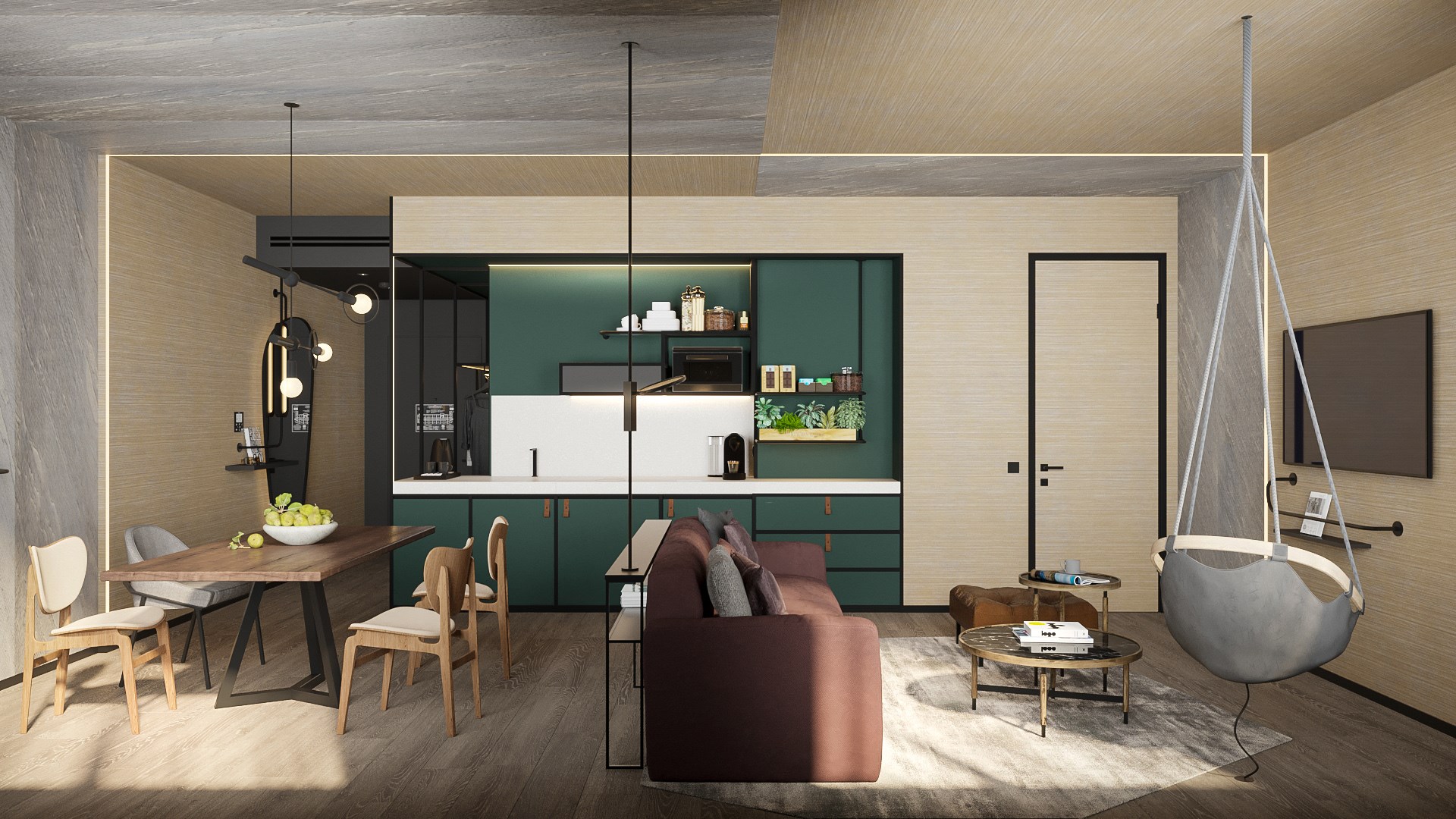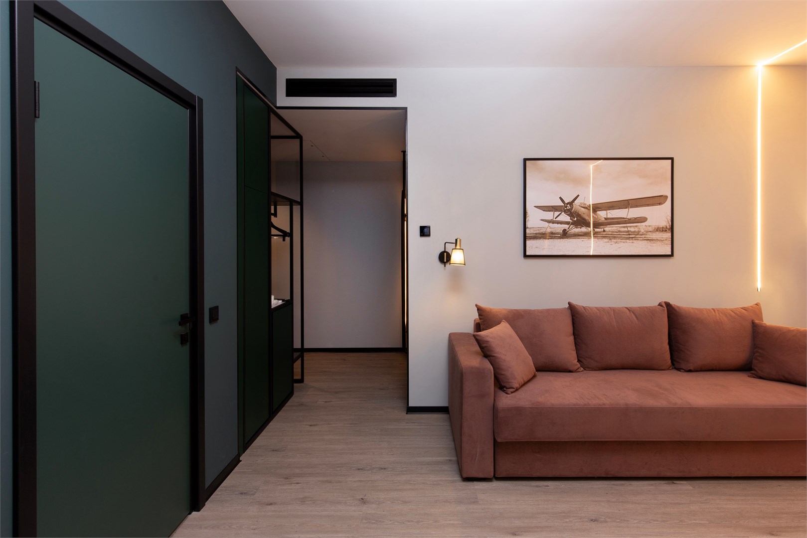 В номере: вешалка, гардеробная, диван, зеркало, качели подвесные, кровать двуспальная, прикроватные тумбочки, пуфик, стол, столик журнальный, столик кофейный, стулья, шкаф, гладильная доска, кондиционер, кофемашина, микроволновая печь, мини-холодильник, сейф, телевизор ЖК, утюг, чайная станция