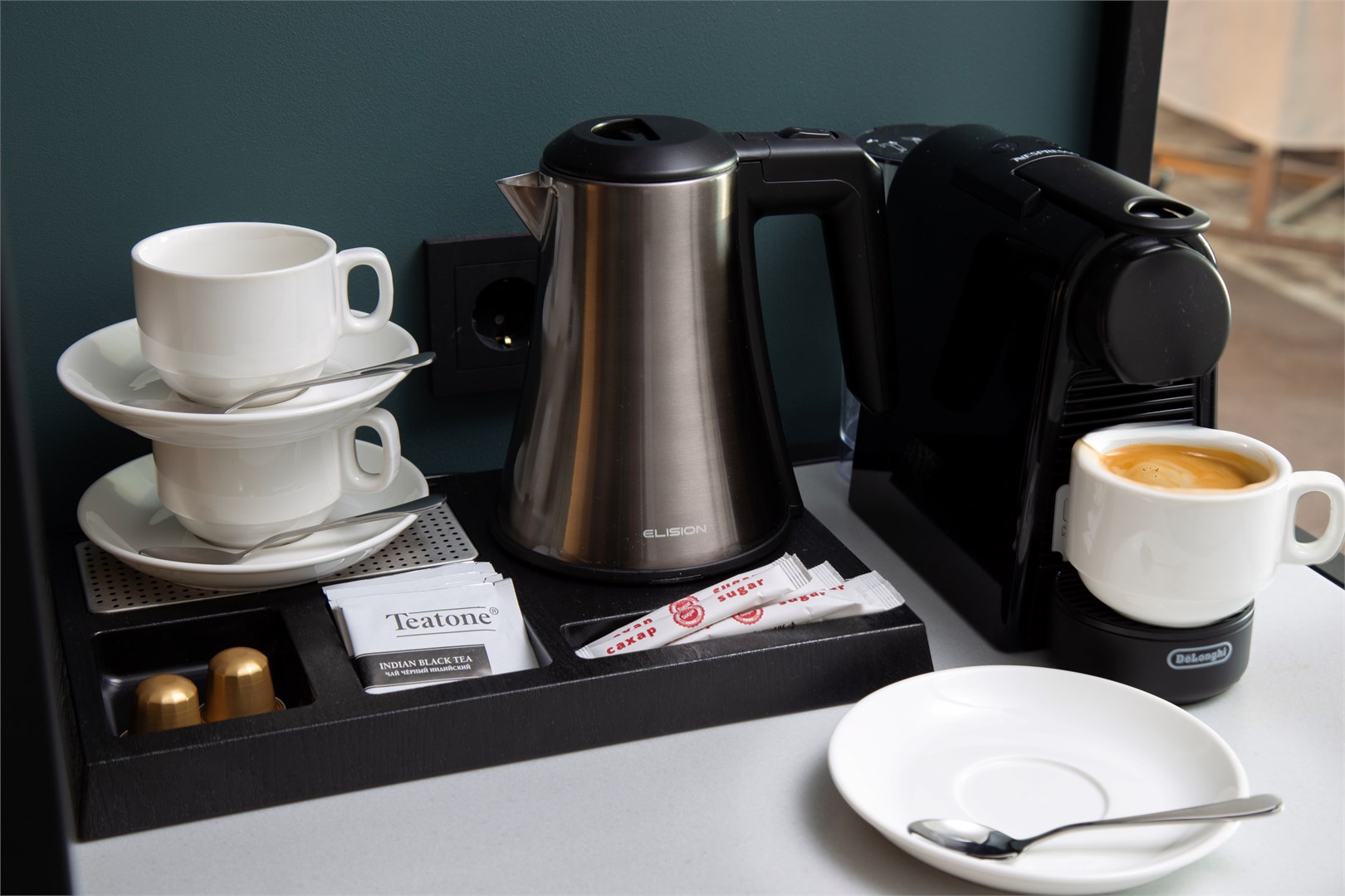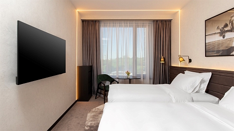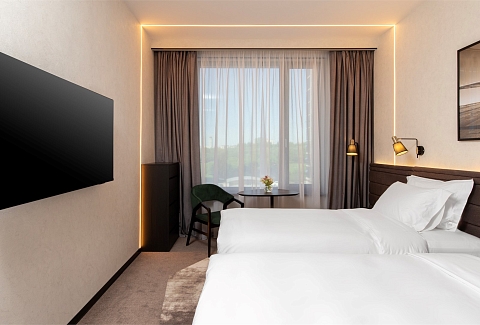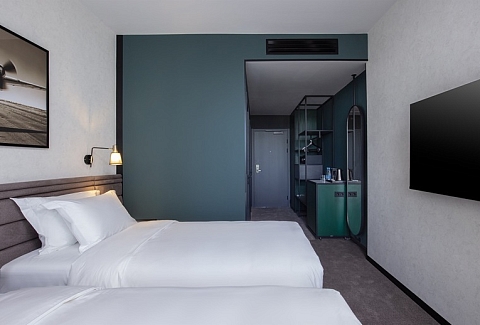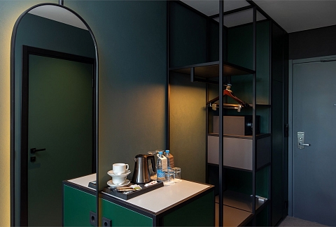 В номере: вешалка, зеркало, кровати односпальные, прикроватные тумбочки, стол, стул, шкаф, гладильная доска, кондиционер, мини-холодильник, сейф, телевизор, телефон, утюг, чайная станция, чайный набор посуды