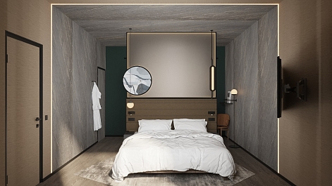 В номере: вешалка, диван, зеркало, кровать двуспальная, прикроватные тумбочки, стол, стул, шкаф, гладильная доска, кондиционер, кофемашина, мини-холодильник, сейф, телевизор ЖК, утюг, чайная станция