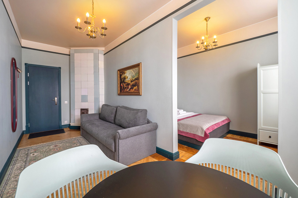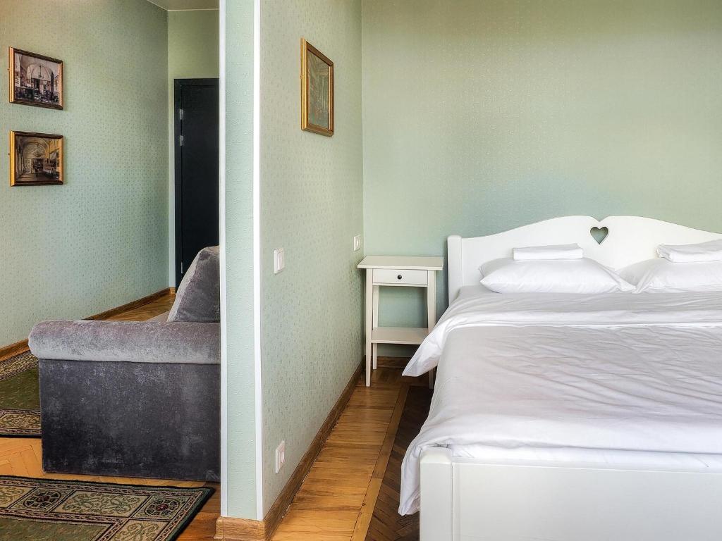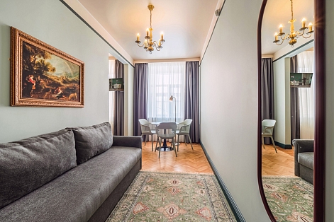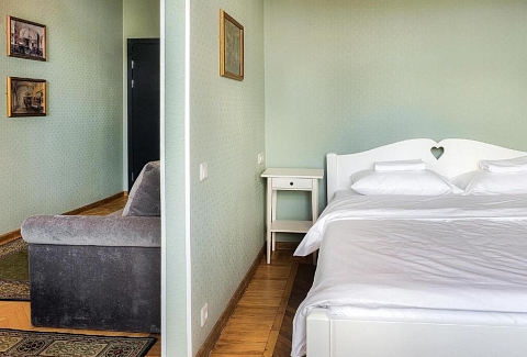 В номере: диван, зеркало, кровать двуспальная, прикроватные тумбочки, стол, стулья, шкаф, телевизор