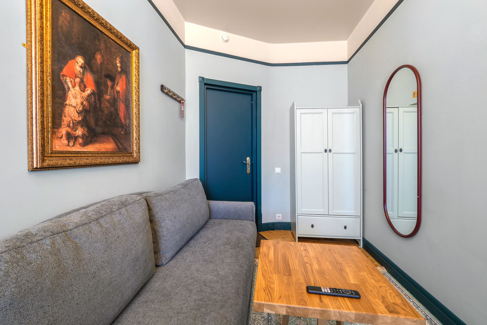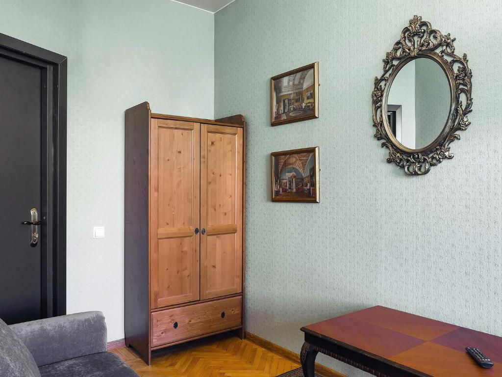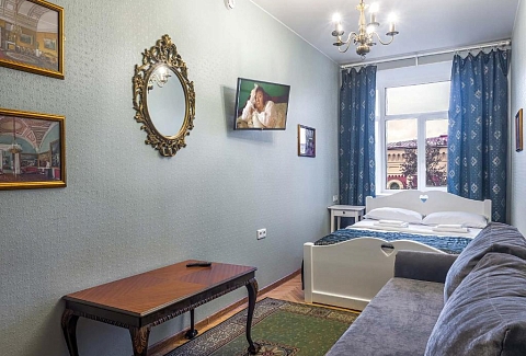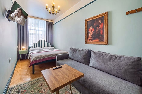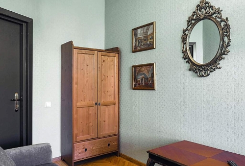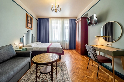 В номере: диван, зеркало, кровать двуспальная, прикроватная тумбочка, стол, шкаф, телевизор