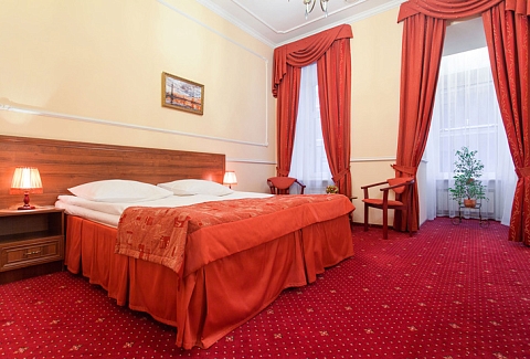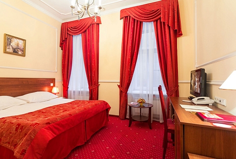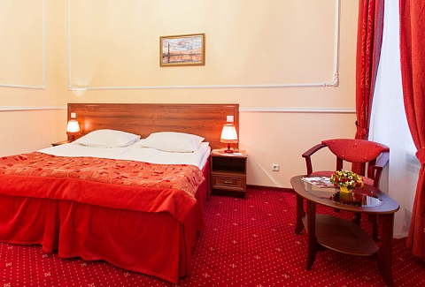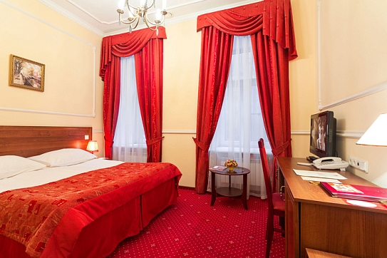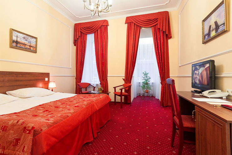 В номере: вешалка, зеркало, кровати односпальные /одна двуспальная кровать, стол, стулья, шкаф, мини-холодильник, сейф, телевизор, телефон, чайная станция, чайный набор посуды