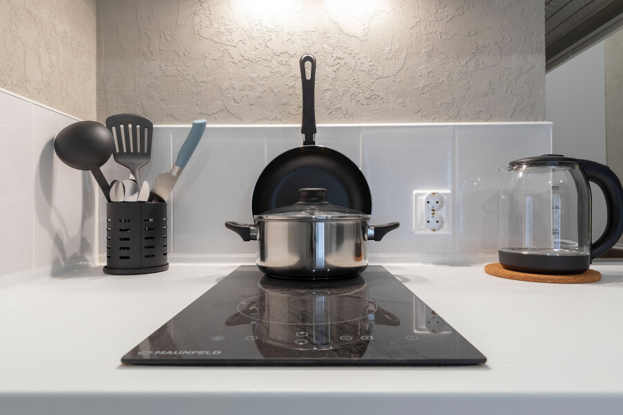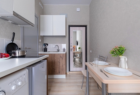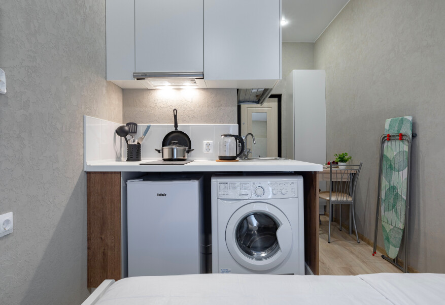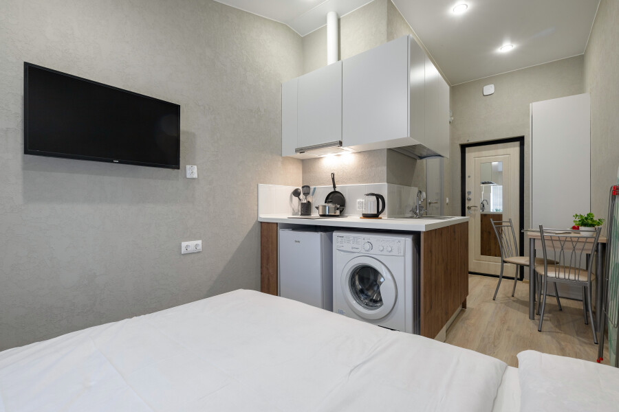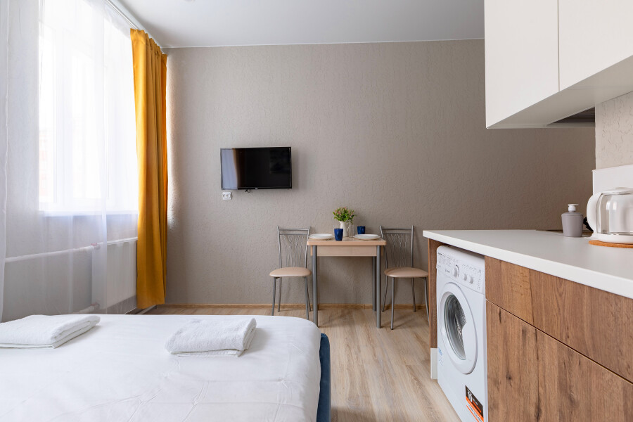В номере: кровать двуспальная, стол, стулья, шкаф, гладильная доска, микроволновая печь, мини-холодильник, набор посуды, плита электрическая, стиральная машина, телевизор, утюг, электрочайник