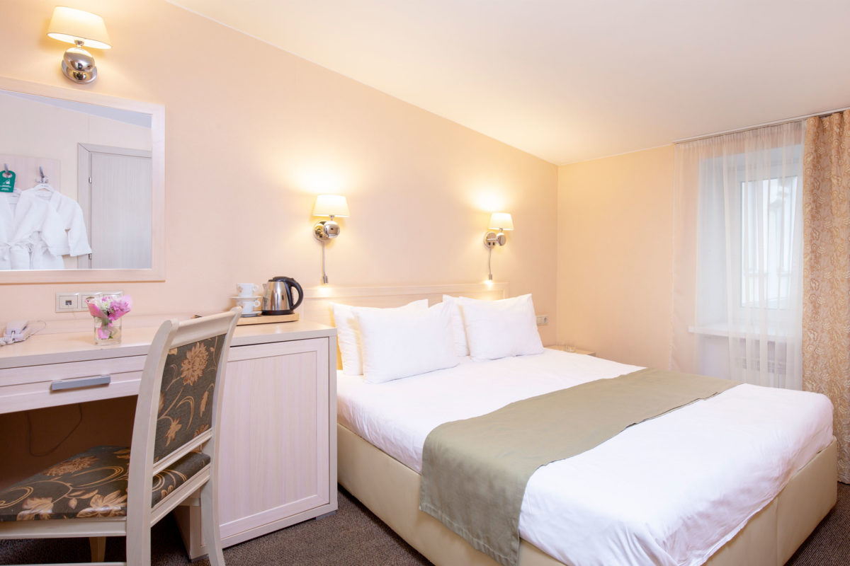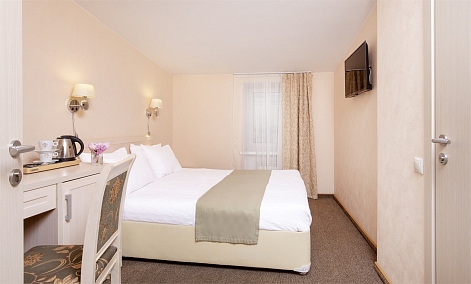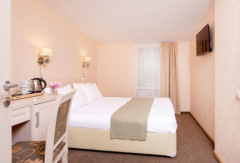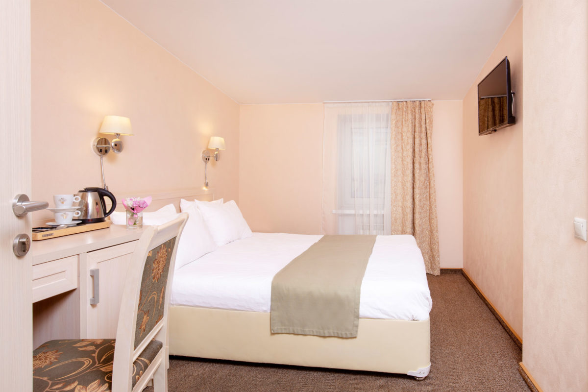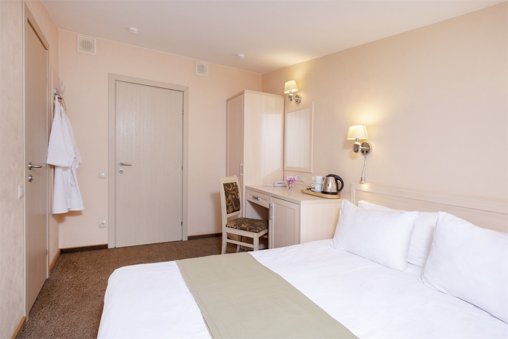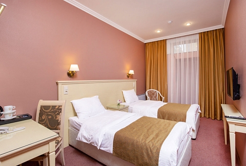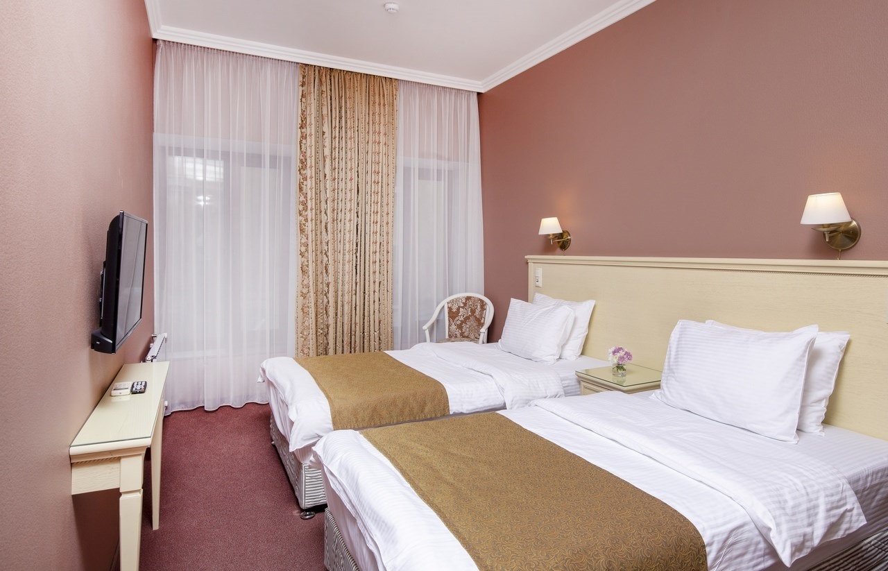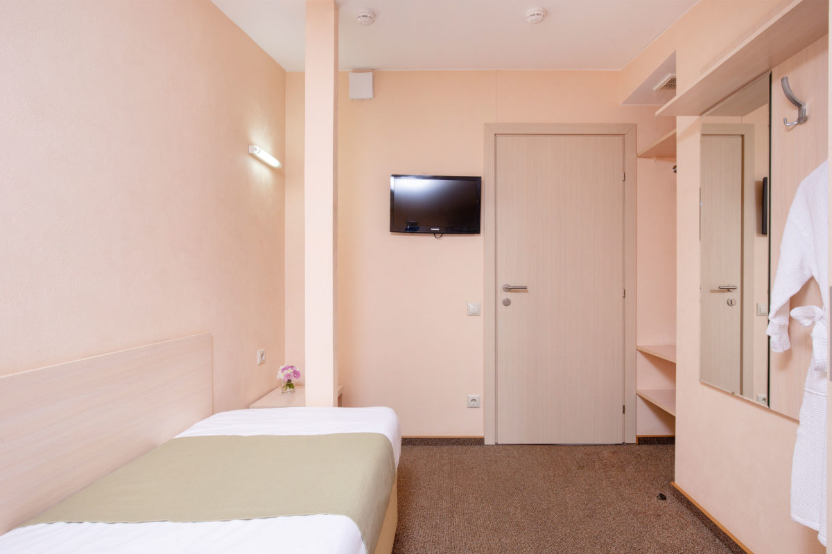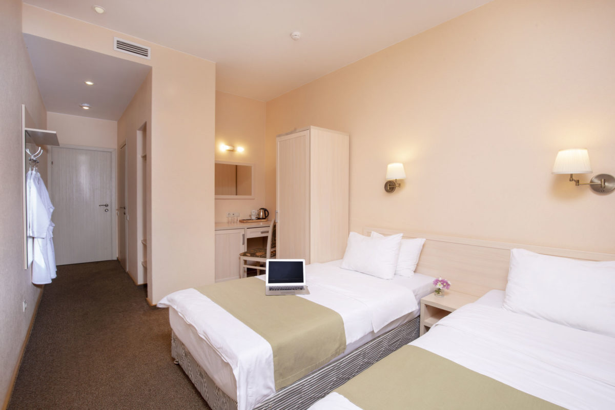 В номере: вешалка, зеркало, кровати односпальные, прикроватные тумбочки, стол, стул, шкаф, мини-холодильник, сейф, телевизор, телефон, чайный набор посуды, электрочайник