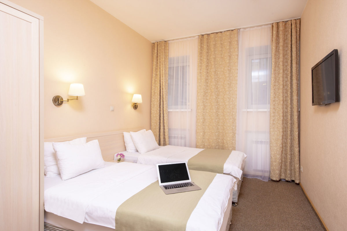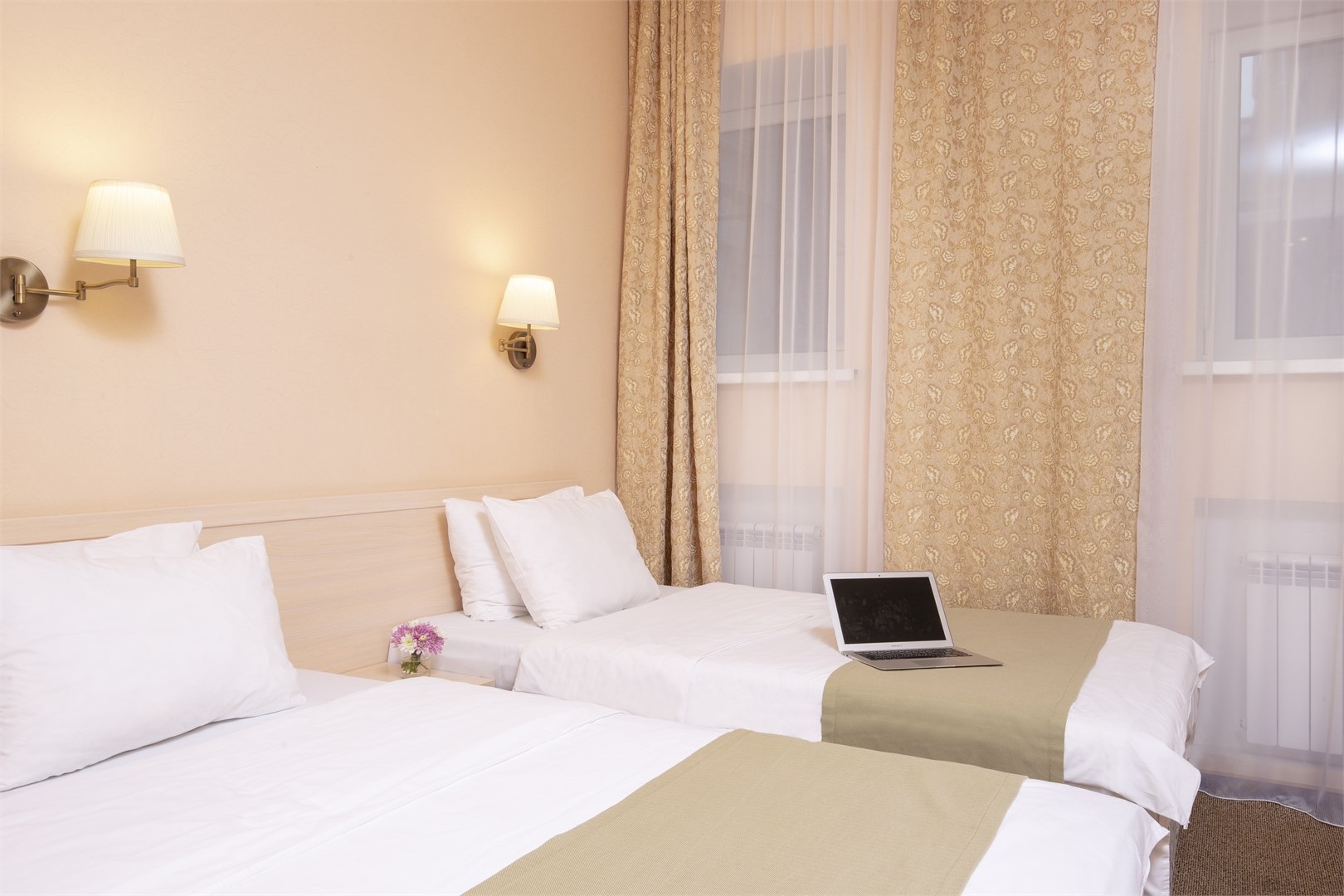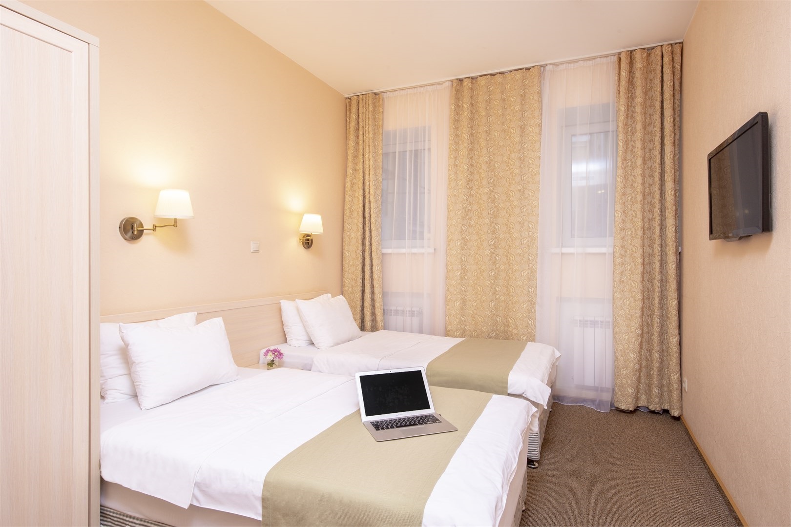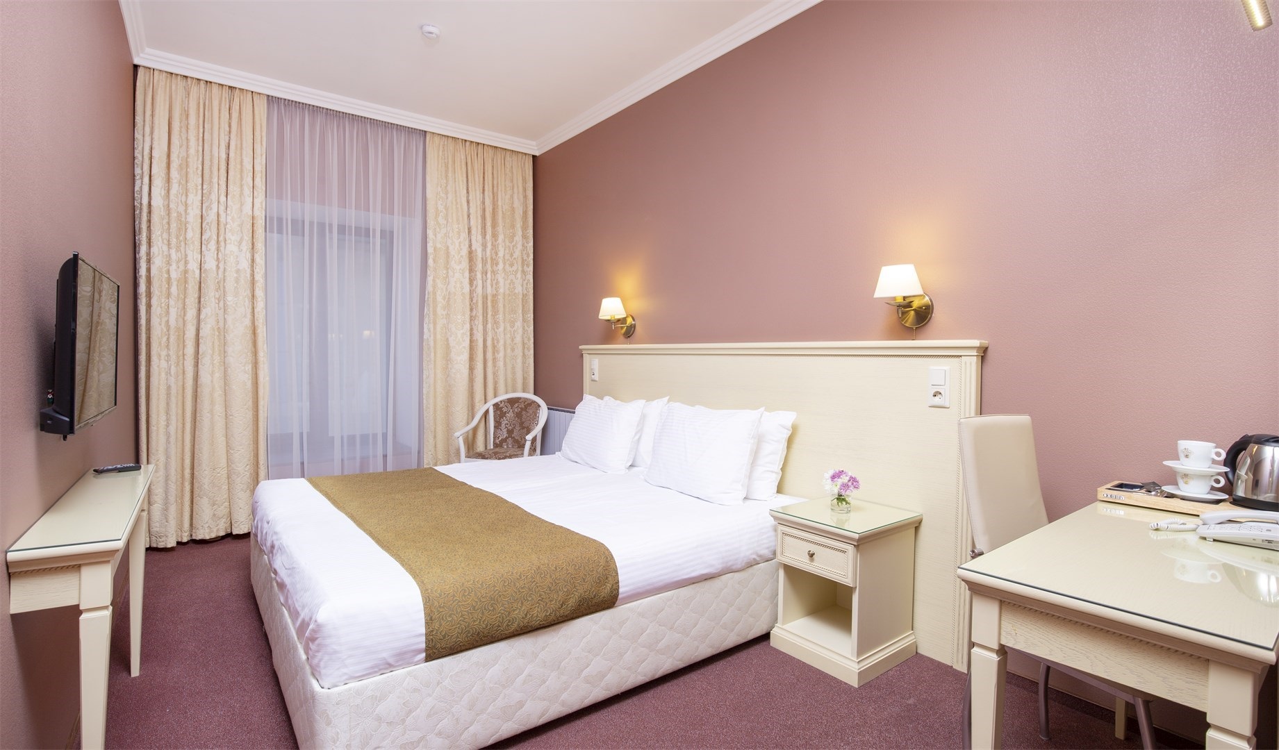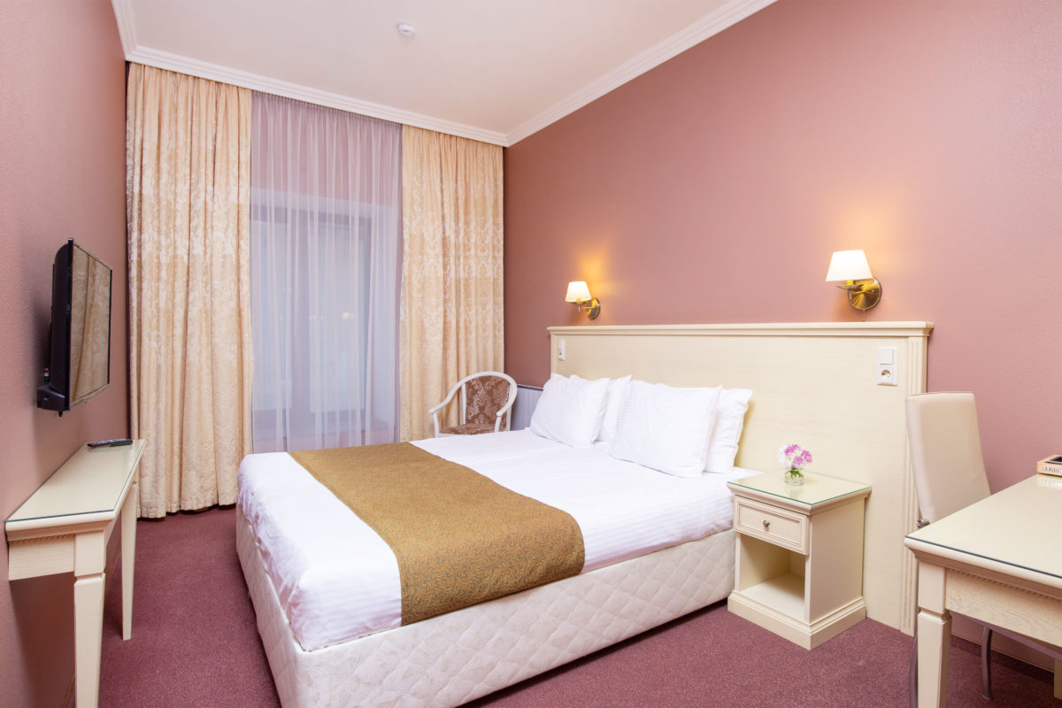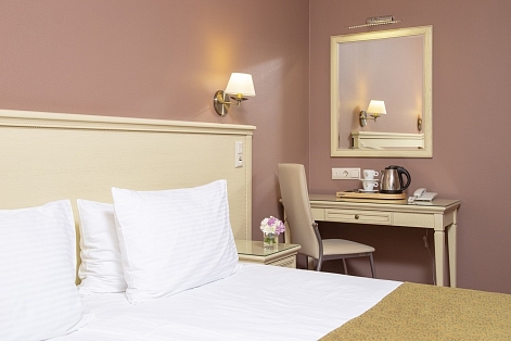 В номере: вешалка, зеркало, кровати односпальные, прикроватные тумбочки, стол, стул, шкаф, мини-холодильник, сейф, телевизор, телефон, чайный набор посуды, электрочайник