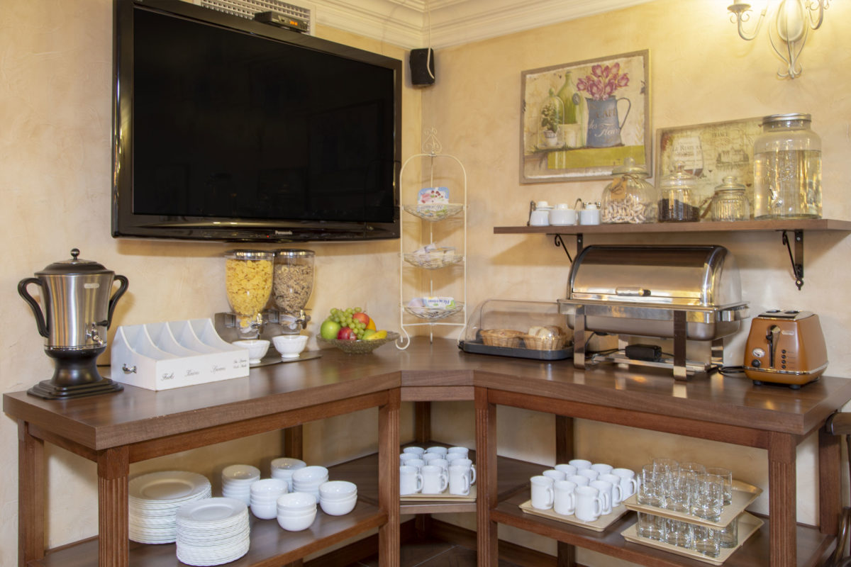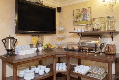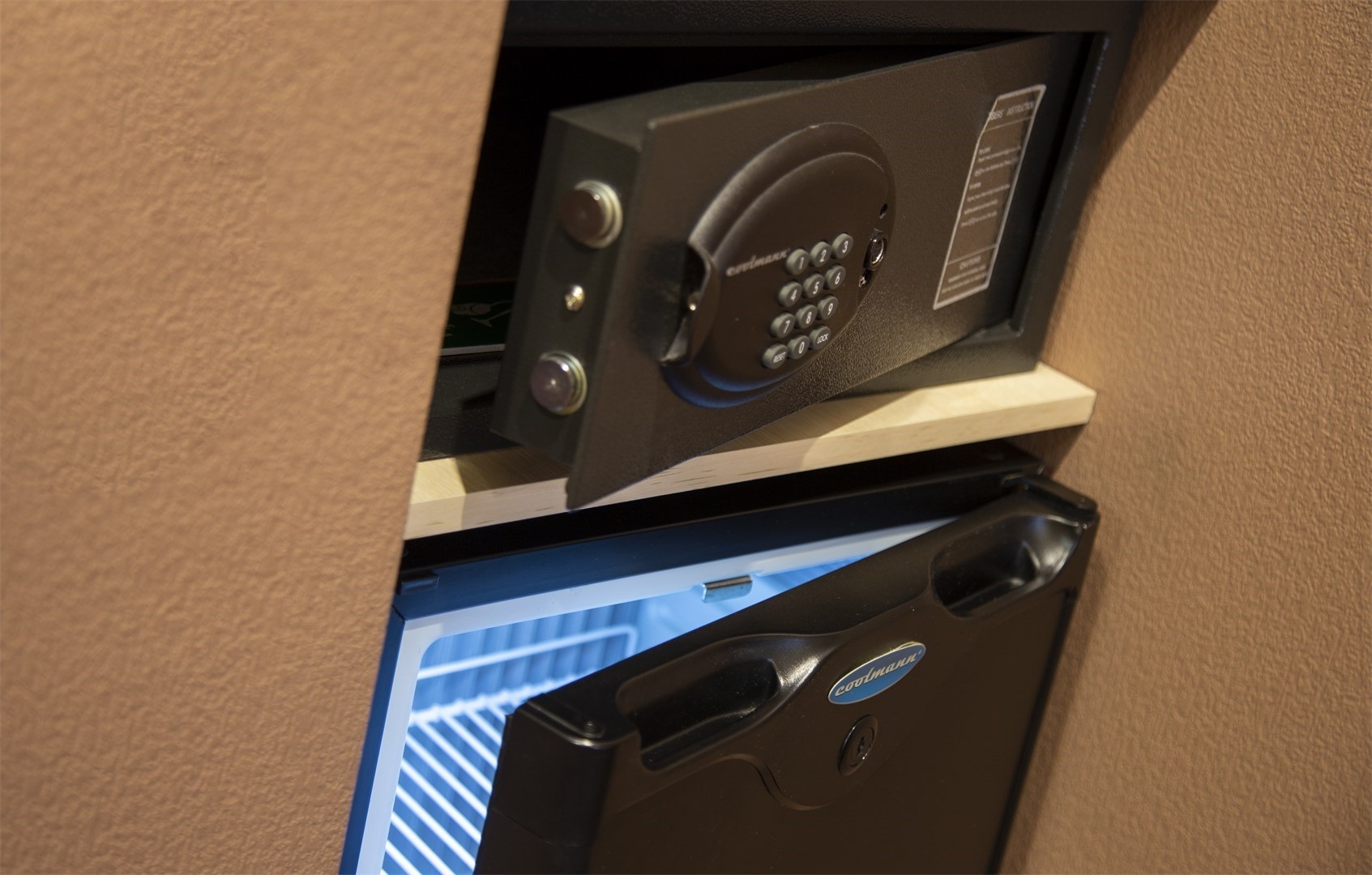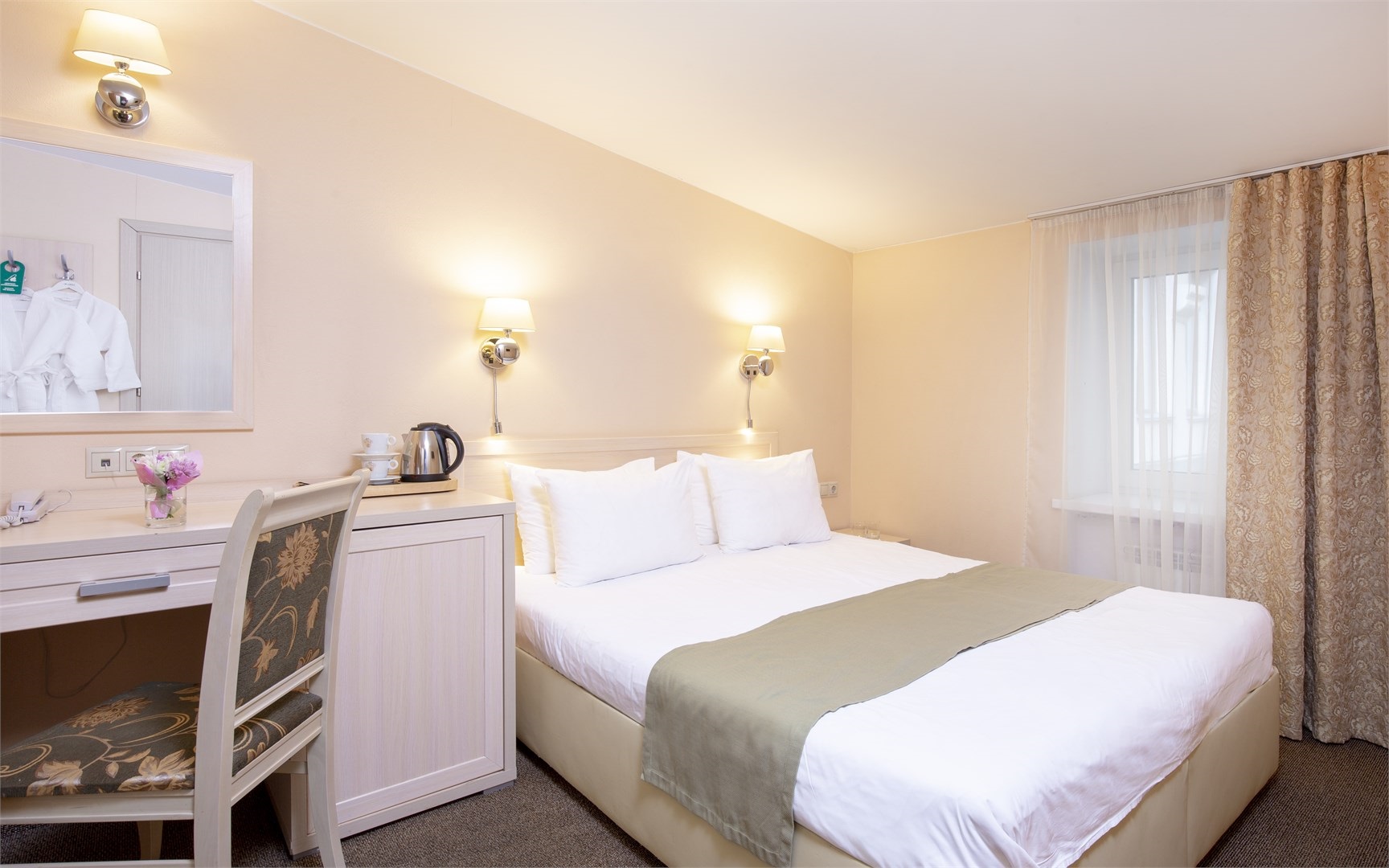 В номере: вешалка, кровать двуспальная, прикроватные тумбочки, стол, стулья, шкаф, мини-холодильник, сейф, телевизор ЖК, телефон, чайный набор посуды, электрочайник