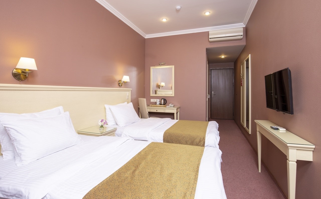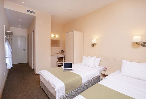 В номере: вешалка, зеркало, кровати односпальные, прикроватные тумбочки, стол, стулья, шкаф, кондиционер, мини-холодильник, сейф, телевизор ЖК, телефон, чайная станция
