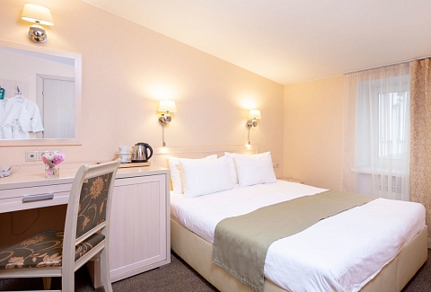 В номере: вешалка, кресло, кровать двуспальная, прикроватные тумбочки, стол, стулья, шкаф, кондиционер, мини-холодильник, сейф, телевизор ЖК, телефон, чайная станция