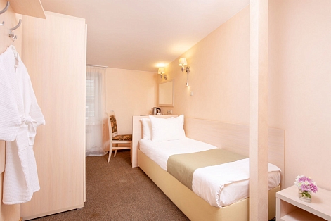 В номере: кровать односпальная, стол, стул, шкаф, мини-холодильник, сейф, телевизор ЖК, чайная станция