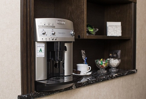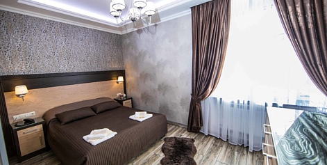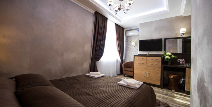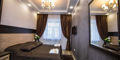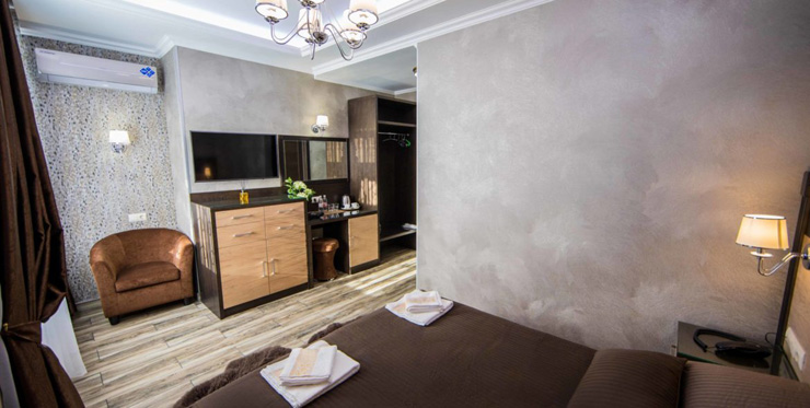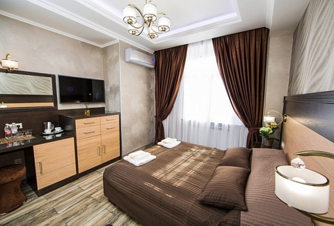 В номере: вешалка, зеркало, кресло, кровать двуспальная, прикроватные тумбочки, стол, стул, шкаф, кондиционер, мини-холодильник, телевизор, телефон, чайный набор посуды, электрочайник